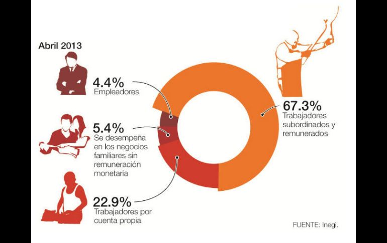 Economía | En abril se ubica en 5.04% de la población económicamente activa Sube desempleo tras dos meses a la baja La tasa de desocupación fue superior a lo estimado por los analistas, que la ubicaban en 4.67 por ciento Por: EL INFORMADOR 24 de mayo de 2013 - 23:07 hs Distribución de la población ocupada por posición en el empleo. EL INFORMADOR / CIUDAD DE MÉXICO (25/MAY/2013).- El desempleo registró un repunte en abril después de dos meses consecutivos de descensos. De acuerdo con cifras del Instituto Nacional de Estadística y Geografía (Inegi), la tasa de desempleo se situó en el cuarto mes del año en 5.04% de la Población Económicamente Activa (PEA), un repunte de 0.18 puntos porcentuales, respecto a 4.86% que se reportó en abril del año pasado. El nivel de desocupación fue superior a lo estimado por los analistas, quienes previeron una tasa de desempleo de 4.67% para el mes de abril. Con cifras desestacionalizadas (es decir, sin factores coyunturales por temporada), en el cuarto mes de 2013 la tasa de desocupación a nivel nacional fue de 5.14% respecto a la PEA, tasa superior en 0.11 puntos porcentuales a la del mes previo. Con información preliminar de la Encuesta Nacional de Ocupación y Empleo (ENOE), el Inegi señaló que el nivel de informalidad mostró una disminución, ya que la tasa de informalidad laboral se ubicó en 59.59% de la población ocupada en abril de 2013, en tanto que un año antes se estableció en 59.91 por ciento. La población ocupada alcanzó 94.96% de la PEA, en tanto que, durante el mes de análisis, la población subocupada, medida como aquella que declaró tener necesidad y disponibilidad para trabajar más horas representó 8.6% de la población ocupada, misma proporción que la registrada un año antes. En su comparación mensual, con cifras desestacionalizadas, este indicador registró un aumento de 0.42 puntos porcentuales en abril de 2013 respecto al mes inmediato anterior. Los datos preliminares de la ENOE, indicaron que 58.55% de la población de 14 años y más es económicamente activa (está ocupada o busca estarlo), mientras que 41.45% se dedica al hogar, estudia, está jubilado o pensionado, tiene impedimentos personales o lleva a cabo otras actividades (población no económicamente activa). La tasa de desempleo entre los varones fue del 5.17 %, 0.33 puntos porcentuales por encima de 4.84% del mismo mes de 2012, mientras que entre las mujeres bajó a 4.83 %, 0.07 puntos menos que la de abril del año pasado, cuando se ubicó en 4.90 por ciento. EL DATOEmpleo por sector Por sector, en los servicios se concentró 42.8% del total de la población ocupada, en el comercio 20%, en la industria manufacturera 15.1%, en las actividades agropecuarias 13.4%, en la construcción 7.4 por ciento. En tanto, en “otras actividades económicas” (que incluyen la minería, electricidad, agua y suministro de gas) dieron empleo a 0.8% y el restante 0.5% no especificó su actividad. > CAEN 10% EN EL PRIMER TRIMESTRE Llegan menos remesas a MéxicoCIUDAD DE MÉXICO.- Las remesas sufrieron una caída de 10% en el primer trimestre de 2013 respecto a la registrada en igual periodo de 2012, al sumar cuatro mil 847 millones de dólares. El Banco de México (Banxico) informó que los ingresos se originaron de 16.5 millones de transferencias, con un valor por remesa de 294 dólares. En su reporte de la balanza de pagos, el Banxico informó que la cuenta corriente de la balanza de pagos presentó un déficit de cinco mil 532 millones de dólares en el primer trimestre del año. Dicho saldo se derivó de la combinación de déficits en la balanza de bienes y servicios de tres mil 433 millones de dólares y en la de renta de siete mil 005 millones de dólares, y del superávit en la balanza de transferencias de cuatro mil 906 millones de dólares. En los primeros tres meses de 2013, el valor de las exportaciones sumó 88 mil 325 millones de dólares, cifra que representó una reducción anual de 1.4 por ciento. El valor de las importaciones de mercancías en el trimestre que se reporta fue de 89 mil 347 millones de dólares, lo que implicó un crecimiento anual de 1.6 por ciento. Notimex Temas Economía Mexicana Desempleo PEA Recibe las últimas noticias en tu e-mail Todo lo que necesitas saber para comenzar tu día Registrarse implica aceptar los Términos y Condiciones