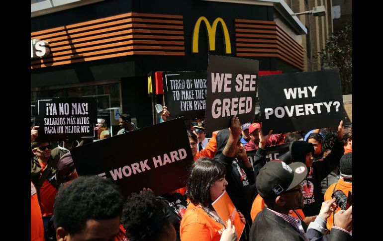 Economía | La campaña por un salario mínimo de 15 dólares se extendió en magnitud y alcance en EU Trabajadores del sector de comida rápida se manifiestan La campaña por un salario mínimo de 15 dólares se extendió en magnitud y alcance para incluir a una amplia gama de trabajadores en EU Por: AP 15 de abril de 2015 - 16:54 hs En Albany, Nueva York, unas 150 personas marcharon y se congregaron frente a un McDonald's. AFP / S. Platt NUEVA YORK, ESTADOS UNIDOS (15/ABR/2015).- La campaña en pos de un salario mínimo de 15 dólares, que comenzó en el sector de comidas rápidas se extendió en magnitud y alcance el miércoles para incluir a una gama de trabajadores que dicen que sus bajas pagas son una forma de injusticia económica. Organizadores de las protestas dijeron que se planeaban marchas para más de 230 ciudades y campus universitarios, además de decenas de ciudades en otros países. En la ciudad de Nueva York, más de 100 manifestantes con carteles que decían "Vemos avaricia" se congregaron en las afueras de un restaurante de McDonald's alrededor del mediodía, lo que hizo que los gerentes cerrasen las puertas para impedir que la muchedumbre ingresase. Manifestantes se tendieron en la acera y algunos llevaban sudaderas que decían "No puedo respirar", en alusión a la muerte reciente de un hombre negro en Nueva York tras ser controlado con una llave de asfixia por la policía. Timothy Roach, un empleado de Wendy's de Milwaukee, Wisconsin, que viajó a Nueva York para las protestas, dijo que la brutalidad policial que enfrentan los hombres negros está vinculada con la forma en que son vistos por los empleadores y la falta de oportunidades económicas que tienen. Dijo que las protestas eran importantes para enviar un mensaje a quienes están a cargo en compañías como McDonald's. "Si ellos no ven que es algo que nos importa a nosotros, entonces no les va a importar a ellos", dijo. En Jackson, Mississippi, unas 30 personas protestaron en un McDonald's antes de ser expulsados. Los organizadores dijeron que aproximadamente la mitad de los manifestantes eran empleados de McDonald's, aunque un representante de McDonald's Corp. dijo que su equipo local concluyó que solamente uno de los participantes era un empleado de la compañía en la región. Uno de los manifestantes fue arrestado por entrada ilegal. Manifestantes se congregaron además en las afueras de restaurantes de McDonald's en ciudades como Denver y Los Ángeles, luego de protestas el martes en Boston y Detroit. En Albany, Nueva York, unas 150 personas marcharon y se congregaron frente a un McDonald's. La iniciativa tiene lugar dos semanas después que McDonald's anunció un aumento salarial para sus trabajadores, lo que indica que la cadena de restaurantes trata de mejorar su imagen como empleador. La campaña, denominada “Fight for $15”, es encabezada por el Sindicato Internacional de Empleados de Servicios (SEIU por sus siglas en inglés) y comenzó a fines del 2012. Desde entonces ha abarcado a otros trabajadores de bajos salarios, como los de los aeropuertos y los de los servicios de atención domiciliaria. Los profesores asistentes se sumaron a las manifestaciones el miércoles, que se planean para más de 230 ciudades y predios universitarios. Kendal Fells, director de organización de la campaña “Fight for $15” (Lucha por 15) dijo que McDonald's sigue siendo un objetivo central de la protesta y que el reciente aumento dispuesto por la cadena revela que los trabajadores de comida rápida ya tienen un sindicato de facto. "Demuestra que los trabajadores están ganando", afirmó. McDonald's dijo hace unos días que aumentaría su salario base un dólar arriba del salario mínimo local, y que daría a los trabajadores la capacidad de recibir tiempo libre pagado. Pero sólo aplica a los trabajadores en los comercios pertenecientes a la compañía, que representa apenas un 10% entre más de 14 mil 300 locales. McDonald's, Burger King y Wendy's dicen que no controlan las decisiones de los restaurantes concesionados. Pero el SEIU responsabiliza también a McDonald's Corp. por las condiciones laborales en las franquicias. En un comunicado enviado por correo electrónico, McDonald's dijo que respeta el derecho a las "protestas pacíficas" y afirmó que sus restaurantes permanecerían abiertos el miércoles. En el pasado, dijo que apenas de 10 a 15 de sus 800 mil trabajadores habían participado. Mientras tanto los organizadores sindicales siguen buscando apoyo público para los trabajadores de bajo salario. Un estudio financiado por el SEIU dijo que las familias de los trabajadores dependen de 153 mil millones de dólares de asistencia pública por año como resultado de su escasa paga. Los organizadores dijeron que la campaña “Lucha por $15” está cambiando la opinión pública sobre el tema. El año pasado, más de una docena de estados y numerosas ciudades aumentaron sus salarios mínimos, según el proyecto Nacional de Derecho del Empleado. Wal-Mart Stores Inc., que también había sido objeto de protestas en reclamo de mejor paga y mejor trato para sus empleados, también anunció recientemente aumentos salariales. Robert Reich, ex secretario de trabajo y profesor de política pública en la Universidad de California en Berkeley, dijo que los salarios estancados para los trabajadores de menor paga ayudan a cambiar la imagen negativa de los sindicatos. "La gente empieza a preguntarse si realmente están mejor sin poder de negociación", comentó Reich. Temas Empresas Manifestaciones en el mundo Nueva York McDonalds Recibe las últimas noticias en tu e-mail Todo lo que necesitas saber para comenzar tu día Registrarse implica aceptar los Términos y Condiciones