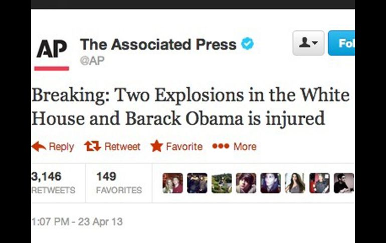 Economía | La cuenta de la agencia AP fue hackeada por el ''Ejército electrónico sirio'' Tuit causa caída momentánea en la bolsa de valores de EU Hace unos días, el mismo grupo hackeó la cuenta de CBS y apenas ayer la del Presidente de la FIFA Joseph Blatter Por: EL INFORMADOR 23 de abril de 2013 - 12:39 hs La cuenta de la agencia de noticias AP fue hackeada y se publicaron mansajes falsos en ella. ESPECIAL / GUADALAJARA, JALISCO (23/ABR/2013).- Esta mañana, la cuenta de la agencia de noticias AP fue hackeada y utilizada para publicar un tuit que provocó, por un momento, la caída de la Bolsa de Valores en Estados Unidos. En la publicación se podía leer lo siguiente: "AL MOMENTO: Dos explosiones en la Casa Blanca. Barack Obama está herido." De forma casi inmediata, en la misma cuenta de la agencia, que de momento está suspendida, se aclaró que la cuenta estaba comprometida y siendo usada por alguien ajeno: "Atención: La cuenta principal de AP en Twitter ha sido hackeada. Los tuits que se están publicando son falsos. Estamos trabajando para solucionar el problema". Se dio una breve conferencia de prensa en la casa blanca en donde, el Secretario de Prensa dijo que todo estaba bien. El Down Jones sufrió una caída drástica, pero se recuperó rápidamente. El grupo autodenominado "Ejército electrónico sirio" se acredita el ataque a la cuenta y lo firma con la etiqueta "ByebyeObama" Hace unos días, el mismo grupo hackeó la cuenta de CBS y apenas ayer la del Presidente de la FIFA Joseph Blatter. EL INFORMADOR/ PATRICIA GALLARDO. Temas Economía Internacional Barack Obama Wall Street Twitter Redes Sociales Lee También México vs Corea del Sur: EN VIVO, dónde ver el partido por el Mundial Sub-17 femenil México, el número uno de Concacaf según ranking de la FIFA Este es el tipo de auto que se vende más en México en 2025 "Israel seguirá violando los derechos del pueblo palestino"; advierte experto Recibe las últimas noticias en tu e-mail Todo lo que necesitas saber para comenzar tu día Registrarse implica aceptar los Términos y Condiciones
