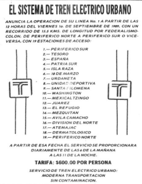El Tren Ligero de Guadalajara llega a tres décadas de existencia transportando a más de 316 mil usuarios diarios en sus dos líneas, obras para poner en funcionamiento la tercera a principios de 2020 y planes para una cuarta.En la edición del 1 de septiembre 1989, EL INFORMADOR destacó el estreno del sistema de transporte con una nota titulada: "Tren ligero, punta de lanza para un programa nacional", como parte del sistema en las grandes capitales del país.El texto detalla los beneficios del sistema eléctrico y resalta el uso de tecnología que lo colocaba entonces a la vanguardia en México y América Latina:"El nuevo sistema de transporte ofrece a la ciudad una gran cantidad de ventajas, como lo es que no produce monóxido de carbono ni ruido, por lo que representa una alternativa importante para evitar la contaminación ambiental y darle solución al problema de movilizar grandes cantidades de personas, además de conectar dos importantes ejes de la zona urbana que registra una gran cantidad de tránsito vehicular."Con el inicio de este servicio, la Zona Metropolitana se convierte en pionera en el país al aplicar esta nueva tecnología de transporte en el país y junto con Río de Janeiro, Brasil, serán las primeras en contar con un servicio de esta naturaleza a través de trenes ligeros, en América Latina".El trayecto de la Línea 1 tiene sus antecedentes en 1974, cuando se planeó la construcción de un sistema de metro. Con ese fin se hicieron obras para crear la Calzada Federalismo, con la consecuente desapareció de la calle Moro y Escobedo, y debajo de la cual se construyó un túnel de 6.6 kilómetros, según información del Sistema de Tren Eléctrico Urbano (Siteur).Pero ante la falta de recursos para seguir con el proyecto subterráneo, se optó por un servicio de trolebuses que arrancó en 1976 con 124 unidades adquiridas en Chicago, Estados Unidos.Desde su inicio, la Línea 1 ha conectado el Periférico Norte con el Periférico Sur por el corredor Federalismo-Colón.Tras su inauguración por el entonces presidente Carlos Salinas de Gortari, EL INFORMADOR detalló en su edición del 2 de septiembre de 1989 que la Línea 1 comprendía un recorrido de 15.5 kilómetros, con más del 50% subterráneo, con 16 trenes de dos vagones cada uno fabricados por la empresa mexicana Concarril.También se refirió a los horarios:“La línea número uno del Tren Ligero operará los 16 trenes diariamente en la ruta de 15.5 kilómetros a partir de las seis de la mañana y hasta las once de la noche, con una frecuencia de diez minutos cada uno y de cinco minutos en las 'horas pico' de mayor demanda de usuarios”.Un anuncio de Siteur publicado en el periódico el día de la inauguración se muestran las 19 estaciones: Periférico Sur, Tesoro, España, Patria Sur, Isla Raza, 18 de Marzo, Urdaneta, Unidad Deportiva, Santa Filomena, Washington, Mexicaltzingo, Juárez, El Refugio, Mezquitán, Ávila Camacho, División del Norte, Atemajac, Dermatológico y Periférico Norte.También indica que la tarifa del nuevo transporte era entonces de 600 pesos por persona. Como referencia, un ejemplar de EL INFORMADOR costaba entonces 800 pesos.La estación más reciente de la L1 es la Auditorio, con el que el trazado se extendió un kilómetro hacia el Norte, también sobre Federalismo, luego de las obras que iniciaron en julio de 2014 y que incluyeron la ampliación estaciones de 60 a 90 metros y 12 nuevos vagones, y un sistema de señalización y control de trenes, entre otros conceptos.La nueva estación fue inaugurada en noviembre del 2018 y en julio de 2019 se entregaron formalmente los trabajos de moderinzación.La línea 2 se construyó a principios de los 90s y comenzó a funcionar el 1 de julio de 1994. Su recorrido en 10 estaciones es entre el Centro de Guadalajara y el Oriente de la ciudad. En conjunto con la línea 1, forman una red de 24 kilómetros.La construcción de la Línea 3 comenzó el 7 de agosto de 2014 y, según las más recientes estimaciones del Gobierno federal, comenzará a operar a principios de 2020.En su arranque trasladará a 230 mil usuarios diariamente en un trayecto que abarca 2.5 kilómetros, desde La Normal hasta Revolución.El 12 de julio de 2019 se firmó un acuerdo entre autoridades estatales y federales para la construcción de la Línea 4, que conectaría el Área Metropolitana de Guadalajara con el municipio de Tlajomulco en un recorrido de 22.5 kilómetros.IM