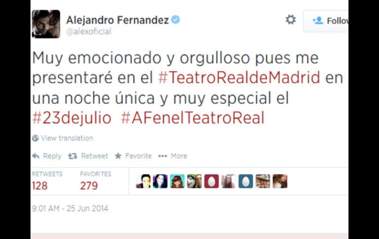 Entretenimiento | Los fans podrán acceder bajo un concurso exclusivo Alejandro Fernández brillará en el Teatro Real de Madrid El potrillo se presentará por primera vez en este recinto en donde los fans podrán acceder bajo un concurso exclusivo Por: NTX 25 de junio de 2014 - 12:40 hs El artista mexicano escribe muy emocionado en su cuenta de Twitter. Foto: @alexoficial. ESPECIAL / GUADALAJARA, JALISCO (25/JUN/2014).- Alejandro Fernández se convertirá en el primer artista mexicano en su género que cante en el escenario del prestigioso Teatro Real de Madrid, en la capital de España. En un comunicado, el equipo de prensa de "El Potrillo" agregó que la presentación, catalogada como única, histórica e irrepetible, tendrá lugar el 23 de julio próximo y sólo se podrá acceder a la misma bajo invitación o tras participar en un concurso exclusivo. Añadió que el anuncio se hizo mediante la cuenta oficial de Twitter del artista, donde además convocó a sus fans, que incluye a españoles que ya tienen entradas para su gira por España, a registrarse y tener la oportunidad de ser parte de esta noche especial y sin precedentes. Señaló que entre mariachis, algo nunca antes visto en el Teatro Real, y una orquesta sinfónica, Alejandro Fernández promete ofrecer uno de los recitales más inolvidables que el teatro haya vivido. Puntualizó que el espectáculo se grabará y quedará plasmado en un CD/DVD que posteriormente saldrá a la venta. Precisó que el cantante mexicano tuiteó: "Muy emocionado y orgulloso pues me presentaré en el #TeatroRealdeMadrid en una noche única y muy especial el #23dejulio #AFenelTeatroReal"; "Acompáñenme #23dejulio #AFenelTeatroReal participa en bit.ly/AFTeatroReal Mariachi, orquesta sinfónica y mucho sentimiento". Resaltó que esos días Alejandro Fernández estará en España como parte de su exitosa gira "Confidencias", además de que aprovecha su tiempo en este país para hacer este concierto único para sus fans y celebrar y honrar sus raíces mexicanas en tierra española. Destacó que con llenos totales de principio a fin, los críticos han elogiado tanto la voz como la producción de primera del "tour Confidencias". Temas Conciertos Cantantes Alejandro Fernández Recibe las últimas noticias en tu e-mail Todo lo que necesitas saber para comenzar tu día Registrarse implica aceptar los Términos y Condiciones