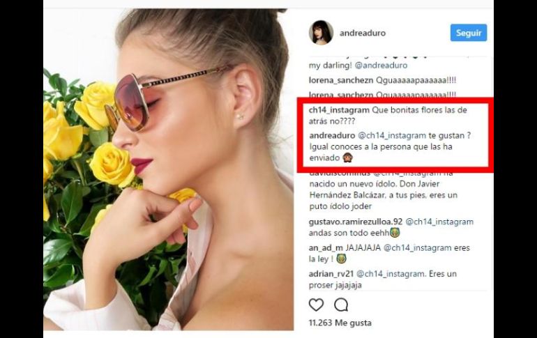GUADALAJARA, JALISCO (29/JUL/2017).- La actriz española Andrea Duro, a la que en días pasados Javier 'Chicharito' Hernández había coqueteado en redes sociales, este fin de semana parece haber dado un paso adelante para que los rumores de una relación se confirmen.A través de su cuenta de Instagram @andreaduro, difundió un breve video en el que aparece con una amiga que le pregunta qué le parece la comida que están degustando y Andrea Duro responde: "Está tan bueno como Javier Hernández".Mientras tanto, 'Chicharito' sigue haciendo su lucha y este sábado parece haberse anotado una buena: Andrea también publicó una foto de ella con unas rosas amarillas que todo parece indicar que fueron un obsequio del jugador mexicano.La pista la dio un comentario de la cuenta @ch14_instagram que decía: "Qué bonitas flores las de atrás ¿no?". Pero esto no paró ahí, sino que tuvo réplica de Andrea de la siguiente manera: "¿Te gustan? Igual conoces a la persona que las ha enviado".Andrea Duro tiene 25 años (cuatro menos que Javier Hernández) y es de nacionalidad española. Nació en la ciudad de Fuenlabrada, cerca de Madrid.Andrea es actriz de televisión y su debut en cine fue en 2010 con la película "Tres metros sobre el cielo" donde interpretó a Mara.La sensualidad y elegancia de Andrea, hace que sea sumamente popular en sus redes sociales. En Instagram, por ejemplo, suma más de 158 mil seguidores.Sin embargo, hay un detalle que podría ser un factor decisivo en la relación: Andrea es fan del Club Barcelona, en tanto es bien conocido el paso de 'Chicharito' por el Real Madrid.En días pasados, 'Chicharito' comentó una foto de Instagram de ella con el siguiente mensaje: “Hola quiero conocerte, me dejas?”. Luego él mismo compartió una imagen acompañado de una misteriosa mujer a la cual no se le veía el rostro.Ninguno de los dos famosos ha descartado ni confirmado el inicio de una relación, pero todo parece indicar que es cuestión de tiempo.