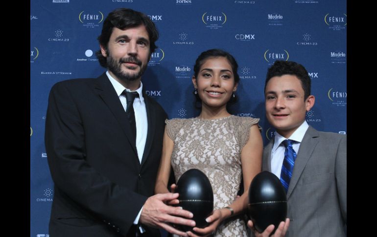 El cineasta Quemada-Díez (i) posa con los actores Karen Martínez y Brandon López en la ceremonia de entrega de los premios Fénix. EFE / M. Guzman