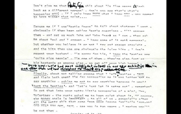 De acuerdo con la información difundida por el diario británico Telegraph, las cartas se suman a un lote de 250 documentos que un coleccionista anónimo estadunidense puso a la venta. Algunas piezas se exhibirán del ocho al 16 de abril en la galería de arte Douglas Elliman, en la Avenida Madison de Nueva York. La carta escrita por John Lennon y enviada a Paul McCartney en 1971 será subastada por Internet el 30 de mayo con un precio inicial de más de 60 mil 740 dólares, de acuerdo con la información difundida. Se trata de un borrador mecanografiado de una carta de John Lennon a Paul McCartney y a quien fuera su esposa, Linda, que refleja la profunda animosidad entre ambos Beatles alrededor de la época en que el cuarteto se separó en 1971. El documento, integrado por dos páginas, no está firmado y se pueden ver algunas correcciones hechas a mano. Un logotipo fotográfico en el papel muestra a Lennon y su esposa Yoko Ono adentro de un círculo con sus labios casi tocándose. "¿Realmente crees que la mayor parte del arte de hoy sucedió debido a los Beatles? No creo que estés tan loco -- Paul -- ¿eso crees? ¡Cuando dejes de creerlo podrías despertar!", escribió Lennon. Por otra parte, también destacan las cartas desesperadas de Marilyn Monroe a su mentor Lee Strasberg. Se calcula que la misiva sin fecha de Monroe al reconocido profesor de actuación podría facturar entre 30 mil y 50 mil dólares el 30 de mayo. "Mi voluntad es débil, no puedo soportar nada. Sueno como loca, pero creo que estoy enloqueciendo", escribió Monroe a mano en papelería con membrete del Hotel Bel-Air. "Es sólo que me paro frente a una cámara y mi concentración y todo lo que trato de aprender me abandona. Entonces siento que no existo en la raza humana del todo". La subasta es la segunda que se hace del coleccionista anónimo; en total, la colección tiene más de tres mil artículos.