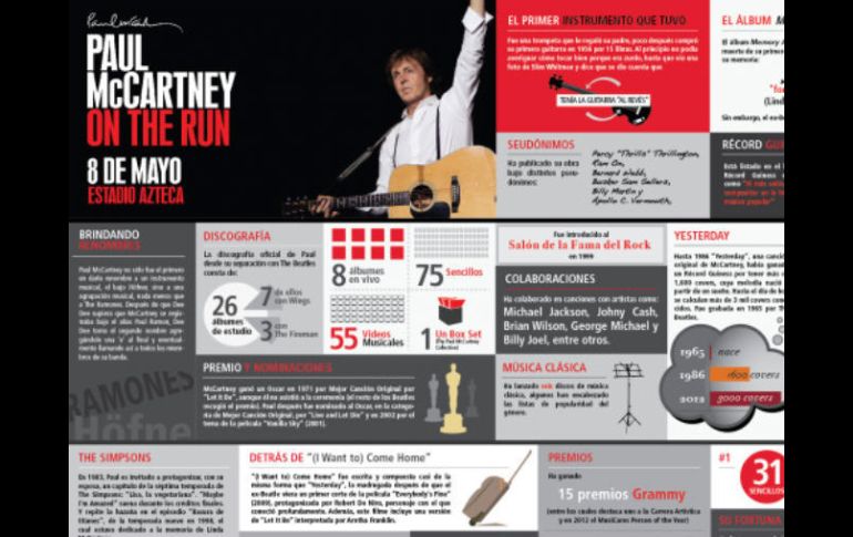 Entretenimiento | El concierto será en el estadio Azteca; pendiente de anunciar la fecha en Guadalajara Confirman a Paul McCartney en México El músico británico se presentará el próximo ocho de mayo detro de la gira ''On the run'' Por: SUN 21 de marzo de 2012 - 14:07 hs En mayo de 2010 el cantante ofreció dos presentaciones en el Foro Sol de la Ciudad de México. ESPECIAL / CIUDAD DE MÉXICO (21/MAR/2012).- Tras dos años de haber actuado en el Foro Sol, el ex Beatle, Paul McCartney regresará a la Ciudad de México para ofrecer un espectáculo en el Estadio Azteca el próximo 8 de mayo, como parte de su gira "On the run". A través de su página de Internet, el cantante británico anunció su espectáculo con el que también visitará Guadalajara. La gira comenzará este sábado en Rotterdam para después continuar por Suiza, Bélgica y Reino Unido. El compositor de 69 años iniciará el 15 de abril su tour por Latinoamérica en Perú y proseguirá por Paraguay y Brasil. En mayo de 2010 el cantante ofreció dos presentaciones en el Foro Sol de la capital mexicana a gracias a su "Up and coming tour", con el cual rompió récord al vender 60 mil boletos a unos minutos de haber anunciado su lanzamiento. Por otro lado, McCartney recibió en febrero de este año su estrella en el Paseo de la Fama de Hollywood. El reconocimiento, que le fue otorgado desde 1993, fue colocado junto a la de Ringo Starr, George Harrison y John Lennon, al frente del edificio de Capitol Records. Temas Espectáculos Conciertos México Paul McCartney Recibe las últimas noticias en tu e-mail Todo lo que necesitas saber para comenzar tu día Registrarse implica aceptar los Términos y Condiciones