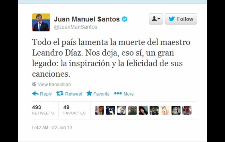 Entretenimiento | El sepelio de Leandro Díaz será el domingo en la tarde El cantautor de vallenato Leandro Díaz fallece La obra más conocida de Díaz es ''La diosa coronada'', de 1949, una historia de desamor elogiada por el Nobel de Literatura colombiano Gabriel García Márquez Por: AP 22 de junio de 2013 - 10:50 hs El presidente colombiano Juan Manuel Santos lamentó el fallecimiento del artista en un mensaje en su cuenta de Twitter. ESPECIAL / BOGOTÁ, COLOMBIA (22/JUN/2013).- Leandro Díaz, uno de los más importantes compositores de la música vallenata colombiana, murió el sábado de un paro cardiorrespiratorio en una clínica del norte del país, informaron sus familiares. Tenía 85 años. "Mi papá murió a eso de la una de la mañana" del sábado en la ciudad de Valledupar, capital del departamento de Cesar y a 655 kilómetros al norte de Bogotá, dijo telefónicamente a The Associated Press Ivo Díaz, hijo del juglar fallecido. "Murió en la clínica del Cesar", precisó el hijo de 49 años y quien en Colombia es un reconocido cantante y compositor vallenato. El artista vallenato muerto dejó seis hijos. "Leandro Díaz nació ciego y a pesar de su limitación se burlaba en sus canciones de su ceguera", indicó vía telefónica la periodista Sara Araújo, una experta en música vallenata. "Mi padre deja toda una obra musical que es un legado, no sólo de su familia, sino de toda la cultura colombiana", sostuvo Ivo Díaz. "El (Dios) la vista me negó para que yo no mirara y en recompensa me dio los ojos bellos del alma", escribió Leandro Díaz. El presidente colombiano Juan Manuel Santos lamentó el fallecimiento del artista en un mensaje en su cuenta de Twitter. "Todo el país lamenta la muerte del maestro Leandro Díaz. Nos deja, eso sí, un gran legado: la inspiración y la felicidad de sus canciones", escribió el mandatario. Temas Música Muerte de Famosos Lee También Ángel Covarrubias, la voz infantil que conquistó Zapopan Fede Dorcaz es despedido con emotivo mensaje de su novia Mariana Ávila "The Life of a Show Girl"; escúchalo en Apple Music por solo 9 pesos Fallece influencer Fede Dorcaz en presunto intento de robo en la CDMX Recibe las últimas noticias en tu e-mail Todo lo que necesitas saber para comenzar tu día Registrarse implica aceptar los Términos y Condiciones