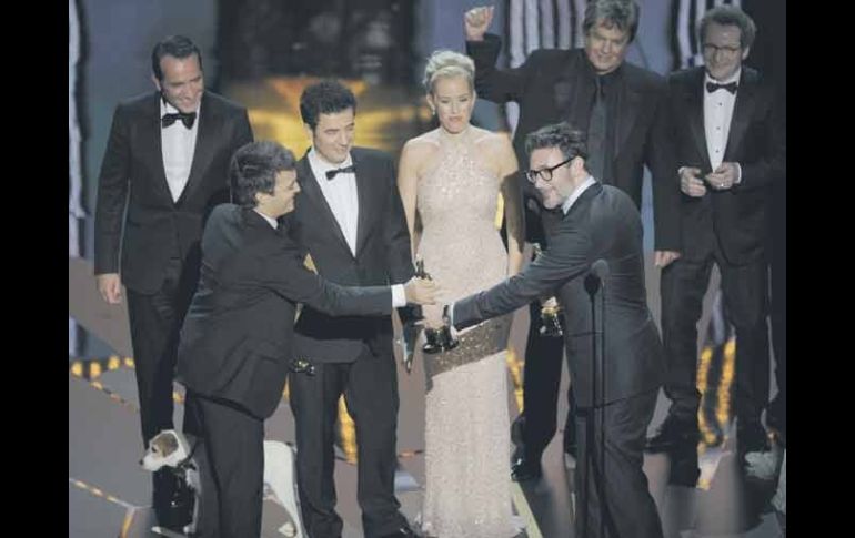 Entretenimiento | La cinta francesa se lleva cuatro galardones El cine mudo de ''El artista'' deja a Hollywood sin palabras La cinta francesa se lleva cuatro galardones. ''La invención de Hugo Cabret'', la más ganadora de la noche Por: EL INFORMADOR 27 de febrero de 2012 - 03:31 hs El elenco de ''El artista'' celebra la entrega de la estatuilla del Oscar que reconoció a esta cinta como la Mejor de la premiación. AP / HOLLYWOOD, ESTADOS UNIDOS (27/FEB/2012).- La entrega anual del Oscar premió a ''El artista'', cinta que levantó cuatro galardones, entre ellos los de Mejor película, actor y director, en una noche que reverdeció la gloria del cine mudo, aunque dejó profundos sinsabores para el talento artístico mexicano, luego de que Demian Bichir y Emmanuel Lubezki se quedaron sin premio en la gala, por su trabajo en "Una vida mejor" y "El árbol de la vida", respectivamente. La ceremonia, celebrada en la ciudad de Los Ángeles, contó con la conducción de Billy Crystal y tuvo como la película más ganadora de la noche a "La invención de Hugo Cabret", aunque sus estatuillas cayeron en las categorías técnicas, dejándole a "El artista" la mayoría de los premios del campo puramente artístico. La cinematografía mexicana tuvo motivos para lamentar por partida doble lo ocurrido anoche en la ceremonia de los premios Oscar, pues además de que no fueron galardonados Demian Bichir ni Emmanuel Lubezki en sus respectivas categorías, la Academia también olvidó incluir a Pedro Armendáriz Jr. en el video de homenaje que cada año se hace para los actores fallecidos. Temas Cine Premios Oscar Recibe las últimas noticias en tu e-mail Todo lo que necesitas saber para comenzar tu día Registrarse implica aceptar los Términos y Condiciones