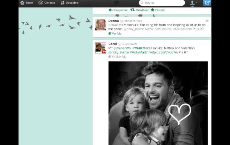 Entretenimiento | A través de las redes sociales publican 40 motivos que más representan al cantante Fans de Ricky Martin se preparan para celebrarle su cumpleaños Con la etiqueta #TSARM se pueden encontrar momentos y hechos trascendentes de Martin Por: EFE 23 de diciembre de 2011 - 10:03 hs Algunas fotos que se han publicado en Twitter son de sus dos hijos quienes nacieron en 2008 por inseminación artificial. ESPECIAL / SAN JUAN, PUERTO RICO (23/DIC/2011).- El cantante puertorriqueño Ricky Martin cumple mañana, sábado, 40 años y como parte de las celebraciones sus millones de seguidores preparan a través de las redes sociales los cuarenta motivos que más representan al artista. Estos momentos y hechos trascendentes en la vida del artista se han publicado durante las pasadas cinco semanas por Twitter a través de la etiqueta #TSARM o "There's Something About Ricky Martin" (Hay algo relacionado con Ricky Martin). Algunos de ellos van desde sus primeros pasos como artista, cuando jugaba con una cuchara como si fuera un micrófono, hasta sus dos hijos, Matteo y Valentino, quienes nacieron en 2008 por inseminación artificial practicada a una madre de alquiler. Los seguidores también destacan del artista boricua sus tatuajes, su libro autobiográfico "Yo", sus roles en musicales en Broadway, sus colaboraciones con artistas como Pavarotti, Madonna, Cristina Aguilera y La Mari, y su fundación para combatir la trata humana en el mundo. Otro que destacan los fans del cantante de "Livin' la vida loca", "María" o "She Bangs" es su interpretación de "La Copa de la vida" en los Grammy Latinos de 1999, que lo ayudó a impulsar su carrera a nivel internacional. Temas Cumpleaños Cantantes Ricky Martin Twitter Lee También Lupillo Rivera, en la mira de la “Ley Olimpia” Ángel Covarrubias, la voz infantil que conquistó Zapopan Belinda denuncia a Lupillo Rivera Gente Bien Jalisco: Revista del 10 de octubre del 2025 Recibe las últimas noticias en tu e-mail Todo lo que necesitas saber para comenzar tu día Registrarse implica aceptar los Términos y Condiciones