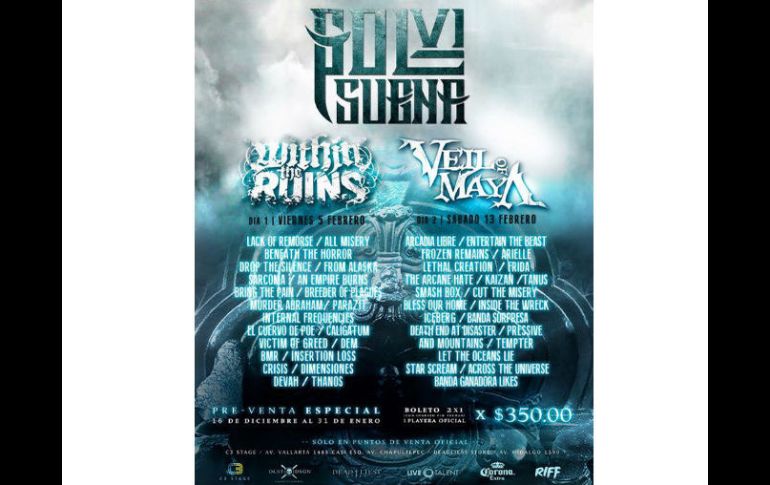 Entretenimiento | Agrupaciones locales y extranjeras convergirán en dos escenarios GDL Suena VI: metal, comida y diversión Serán dos fines de semana en los que habrá exponentes de bandas deathcore, metalcore dentro del C3 Por: EL INFORMADOR 3 de febrero de 2016 - 17:27 hs Serán dos días en que las voces guturales estremezcan el C3 FACEBOOK / C3 Stage GUADALAJARA, JALISCO (03/FEB/2016).- Un festival que poco a poco comienza a ser tradición en la perla tapatía, Gdl Suena en su sexta edición, se dividirá en dos días para ofrecer un mayor cartel, y headbangings garantizados; el próximo viernes 5 y sábado 13 de febrero en el C3. Se trata de dos fines de semana en los que se expondrá una escena que existe pero que no se le da la misma cobertura que a otros géneros, de tal suerte, resulta ser una plataforma ideal para disfrutar de bandas deathcore, metalcore y post-hard core internacionales y propuestas de la región. El viernes 5, la agrupación principal serán los de Massachusetts 'Within The Ruins', mientras que el 13 cerrarán los de Illinois, Estados Unidos 'Veils of Maya. En ambos días el talento local correrá a cargo de bandas como Arcadia Libre, Beneath The Horros, Insertion Loss, All Misery entre muchas otras más. Calidad a buen precio Uno de los atenuantes del festival es darle apertura al género pero sin un alto costo monetario, ya que por $350 podrán entrar dos personas a los dos días, buscando así apoyar los bolsillos de los asistentes. Los boletos se pueden adquirir en taquillas del C3, y aprovechar el servicio a domicilio que éste ofrece en los teléfonos 3339545204 o al 19555773 Para saber del viernes 5 de febrero Acceso a puertas 4pm Primer banda: Thanos Fin del evento 12 de la noche 2 Escenarios simultáneos Venta de mercancía oficial de las bandas Servicio de paquetería Venta de comida, refrescos y cerveza Beer Pong No hay reingreso Más detalles del evento AQUÍ Plus El viernes 12 de febrero habrá una prefiesta en donde se contará con la presencia chicas 'Suicide Girls'. De 9 pm a 12 am habrá acceso libre, mientras que a partir de la media noche sólo se podrá acceder mostrando tu boleto del Gdl Suena. A destacar: Let The Oceans Lie es una banda local que estará presente en el GDL Suena VI. La agrupación estrenó el pasado 17 de enero su primer Ep 'Cáncer' el cual contiene líricas en español y con influencias de bandas como 'Killswitch Engage' y 'Parkway Drive, buscan expandir su talento musical. EL INFORMADOR / HÉCTOR NAVARRO Temas Música Conciertos Lee También Tecate Pal Norte 2026: Estas son las fechas y sede t.A.T.u anuncia concierto en México: precio de boletos y cuándo salen a la venta Angélica Vale, viral por decir que "ningún latino puede pagar" para ir al Super Bowl Ticketmaster tiene todos estos conciertos al 2x1 en Monterrey Recibe las últimas noticias en tu e-mail Todo lo que necesitas saber para comenzar tu día Registrarse implica aceptar los Términos y Condiciones