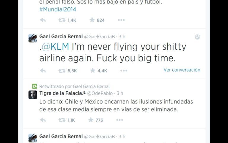 Entretenimiento | El actor y director mexicano insulta a la empresa en su cuenta de Twitter Gael García explota contra aerolínea holandesa El actor y director mexicano insulta a la empresa en su cuenta de Twitter Por: SUN 29 de junio de 2014 - 15:01 hs El actor escribió en un tuit que jamás volaría en la aerolínea otra vez. ESPECIAL / CIUDAD DE MÉXICO (29/JUN/2014).- El actor y director de cine mexicano Gael García Bernal explotó en contra de una aerolínea holandesa que se mofó de la derrota del Tricolor a través de Twitter. "Adiós Amigos! #NEDMEX", fue el tuit que lanzó la aerolínea Royal Dutch Airlines, acompañado de una imagen que muestra un letrero que indica la salida, similar a las señalizaciones de aeropuertos, pero en él también se destaca la silueta que emula a un mexicano. La aerolínea borró este mensaje de su cuenta de Twitter, pero el registro quedó marcado en las redes sociales. El mensaje fue criticado por Gael quien explotó en esta red social ( @GaelGarciaB), incluso con groserías: "@ KLM nunca volveré a volar en su aerolínea de mier... Jod... a lo grande", escribió. La derrota que sufrió México con un marcador 2-1 a favor de Holanda dejo un amargo sabor de boca para los mexicanos y las reacciones no se hacen esperar. Temas Cine Actores de cine Selección mexicana Gael García Bernal Mundial Brasil 2014 Lee También Detienen a Miguel Ángel 'N', vinculado por el homicidio del sacerdote Bertoldo Pantaleón Fallece Junior Dutra al realizarse cirugía estética en manos de dentista sin licencia México busca frenar el paso perfecto de Argentina en Mundial Sub-20 Lista actualizada de selecciones que ya clasificaron al Mundial 2026 Recibe las últimas noticias en tu e-mail Todo lo que necesitas saber para comenzar tu día Registrarse implica aceptar los Términos y Condiciones