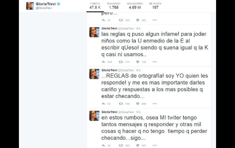 GUADALAJARA, JALISCO (01/ENE/2017).- La cantante mexicana Gloria Trevi empezó de mal humor el año en Twitter, al inaugurar sus publicaciones de 2017 con una larga queja contra quienes le señalaron que cometió un error ortográfico.La intérprete se dirigió a “todos los eruditos” que la criticaron por escribir la palabra “vamos” con la letra be, aseguró que fue un error de dedo y siguió su protesta con varias publicaciones.A lo largo de esas quejas, dejó en claro que las reglas de ortografía no son su prioridad: “Me es más importante darles cariño y respuestas a los más posibles que estar checando las reglas q puso algun infame!”.Entre otras convenciones, se quejó de que haya que usar la letra q con una u intermedia, como en la palabra “que”, cuando, dijo, “suena igual que la K que casi ni usamos”.
