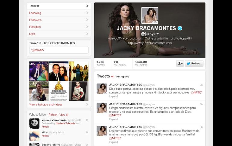 Entretenimiento | Bracamontes dio a luz a un niño y una niña, sin embargo, el varón falleció Jacky Bracamontes ya es mamá La actriz compartió que a pesar de la muerte del niño, están felices con su pequeña hija Por: EL INFORMADOR 30 de marzo de 2013 - 09:47 hs La actriz y conductora, Jacky Bracamontes, anunció en su cuenta de twitter que se convirtió en madre. ESPECIAL / GUADALAJARA, JALISCO (30/MAR/2013).- La actriz y conductora, Jacky Bracamontes, anunció en su cuenta de twitter que se convirtió en madre de una niña esta madrugada. "Les compartimos que anoche nos convertimos en papás de una hermosa nena que pesó 2.132kg. Bienvenida a nuestra familia" Bracamontes dió a luz a un niño y una niña, sin embargo, el niño falleció debido a problemas respiratorios según lo publicó la actriz: "Desgraciadamente nuestro bebito tuvo algunas complicaciones para respirar y no está con nosotros. Es un angelito a un lado de Dios" En otro tuit compartió que a pesar de la muerte del niño, están felices con su pequeña hija: "Dios sabe porqué hace las cosas, Ha sido difícil, pero estamos muy contentos de que nuestra princesa, Minijacky está con nosotros" Temas Farándula Actor- Actriz Jacqueline Bracamontes Lee También Eleazar Gómez está siendo "cancelado" de La Granja VIP 2025 por esta razón Lupillo Rivera, en la mira de la “Ley Olimpia” Revelan llamada al 911 con que se reportó la muerte de Diane Keaton Muere la actriz Diane Keaton a los 79 años Recibe las últimas noticias en tu e-mail Todo lo que necesitas saber para comenzar tu día Registrarse implica aceptar los Términos y Condiciones