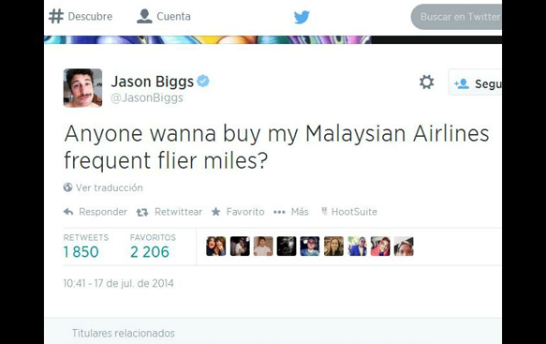 Entretenimiento | El actor se refirió en tono de broma a lo ocurrido en Ucrania Jason Biggs, en controversia por tuit de avión malasio El actor de 'American pie' se refirió en tono de broma a lo ocurrido en Ucrania donde murieron cerca de 300 personas Por: EL INFORMADOR 17 de julio de 2014 - 16:16 hs Los tuits del actor cómico fueron retomados por la prensa internacional. ESPECIAL / GUADALAJARA, JALISCO (17/JUL/2014).- Luego de darse a conocer la caída del avión malasio en Ucrania, el actor Jason Biggs publicó en su cuenta de Twitter un mensaje en tono cómico el cual no fue bien recibido por la comunidad que estuvo al pendiente de los hechos. “¿Alguien quiere comprar mis millas de viajero frecuente de Malaysian Airlines?” publicó el actor de 'Orange is the New Black'. Algunos usuarios tacharon de poco sensible el tuit del actor de ‘American Pie’. "¿De verdad? ¡Qué idiota! Una disculpa a las víctimas de los familiares." Escribió @pattysmattyvt como respuesta al mensaje. Luego de la lluvia de críticas y que algunos medios como TMZ retomaran el tuit. Biggs se defendió escribiendo que sólo era una broma. "No tienen que pensar que es chistoso y ni siquiera tienen que estar en mi página de Twitter". En un último tuit, el actor escribió "Es triste por las víctimas y sus familias, obviamente. Pero aparentemente Malaysia Airlines es una gran aerolínea. Va a ser difícil de recuperar". Temas Farándula Actores de Hollywood Ucrania Escándalos de la farándula Lee También "Streamer" transmite su parto en vivo y causa revuelo en redes sociales España consigue su boleto a los cuartos de final del Mundial Sub-20 Los mejores MEMES que dejó la gran final de La Casa de los Famosos México Rusia ataca de forma masiva varias regiones de Ucrania Recibe las últimas noticias en tu e-mail Todo lo que necesitas saber para comenzar tu día Registrarse implica aceptar los Términos y Condiciones