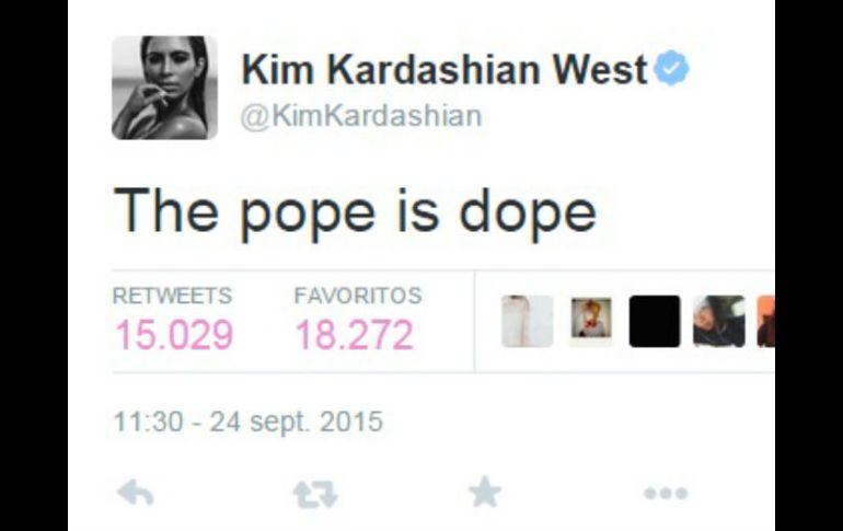 Entretenimiento | A propósito de la visita del Pontífice en EU, la socialité escribe el comentario Kim Kardashian causa polémica por tuit sobre el Papa A propósito de la visita del Pontífice en EU, la socialité escribe el comentario en Twitter Por: SUN 24 de septiembre de 2015 - 21:06 hs El mensaje ha sido replicado más de 15 mil ocasiones y ha sido marcado como favorito más de 18 mil veces. TWITTER / @KimKardashian CIUDAD DE MÉXICO (24/SEP/2015).- Si en algo es especialista Kim Kardashian es en saber cómo y cuándo aprovechar cualquier coyuntura para hacerse de protagonismo. El suceso de este miércoles fue un tuit de apenas cuatro palabras que hasta el momento ha sido replicado más de 14 mil ocasiones y ha sido marcado como favorito más de 17 mil veces. A propósito de la presencia del papa Francisco en Estados Unidos, la modelo y estrella de “reality” tuiteó: “The pope is dope”, un juego de palabras que involucra una rima y podría interpretarse como “el papa está dopado”. Sin embargo, también es una expresión que en el uso cotidiano sirve para decir lo bueno que es algo. Pese a que la socialité no expresó más de su postura respecto a la presencia del Pontífice en la nación norteamericana, el tuit originó el rotundo desacuerdo de fieles católicos, quienes reprobaron la acción. Comentarios como “tú estás dopada”, “eres una vergüenza” o “tú gitana, sucia, irrespetuosa” proliferaron en Twitter, mientras que hubo quienes lo tomaron como una broma: “Esta rima es mejor que cualquier cosa que Kanye haya escrito”, escribió el usuario @thepinkstain. Actualmente Kim Kardashian está por alcanzar los 45 millones 500 mil seguidores en la red social. Temas Farándula Kim Kardashian Twitter Papa Francisco Lee También Dr. Simi llega al Vaticano; le entregan peluche al Papa León XIV Sociales: Domingo en los toros, concluye la primera parte de la Temporada Grande 2025 Los mejores MEMES que dejó la gran final de La Casa de los Famosos México Trump castigó a YouTube tras ganar millonaria demanda Recibe las últimas noticias en tu e-mail Todo lo que necesitas saber para comenzar tu día Registrarse implica aceptar los Términos y Condiciones
