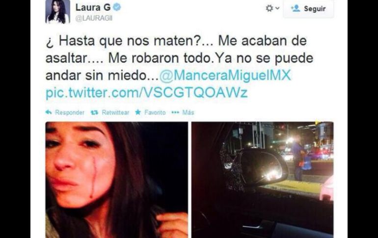 Entretenimiento | La conductora sufre un asalto y tuitea una fotografía con la cara ensangrentada Laura G sufre asalto La conductora sufre un asalto y tuitea una fotografía con la cara ensangrentada Por: SUN 8 de abril de 2014 - 08:46 hs Aunque en el twitter Laura borró este primer post, en Facebook aún se puede leer el mismo mensaje. ESPECIAL / CIUDAD DE MÉXICO (08/ABR/2014).- La conductora del programa matutino Sabadazo, María Sonia Laura González, Laura G, sufrió un asalto este lunes, según reveló ella misma en sus cuentas de Facebook y Twitter. "¿Hasta que nos maten?... Me acaban de asaltar.... Me robaron todo. Ya no se puede andar sin miedo..." escribió la reportera de espectáculos en ambas redes sociales. Aunque en el Twitter borró este primer post, en Facebook aún se puede leer el mismo mensaje, junto a una fotografía de su rostro, al parecer con rastros sangre. "Gracias por sus mensajes, todo bien.... Buenas noches!" agregó minutos más tarde, para agradecer las muestras de apoyo de sus seguidores. Temas Televisión Conductor-Locutor Redes Sociales Lee También Dónde ver EN VIVO los juegos de MLB, HOY 15 de octubre En tele abierta y de paga: Televisa transmitirá la F1 en México Restaurante "El Atracadero" reaparece en Veracruz tras viajar 300 km (VIDEO) Ella es La Bea, concursante de "La Granja VIP", que está generando revuelo Recibe las últimas noticias en tu e-mail Todo lo que necesitas saber para comenzar tu día Registrarse implica aceptar los Términos y Condiciones