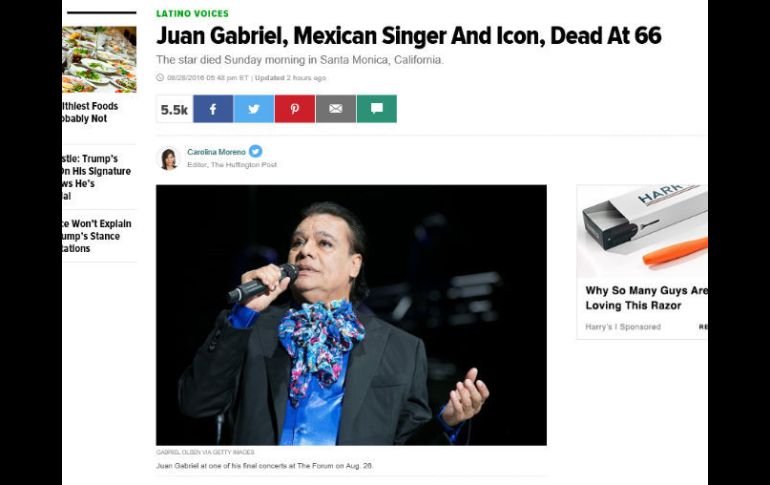 GUADALAJARA, JALISCO (28/AGO/2016).- La muerte de un divo no podría pasar desapercibida, menos aún la del excéntrico 'Divo de Juárez'. Una noticia que impactó no sólo al ámbito nacional sino que también llegó a oídos internacionales: Juan Gabriel falleció a los 66 años.Cada uno con una perspectiva diferente, cada uno con una pertenencia menor pero no por ello una importancia diluida. Los medios internacionales, especializados y no especializados, dieron eco del fallecimiento de una de las figuras más importantes de México, de quien fuera considerado uno de los cantautores más prolíficos de nuestro país.Por ello, era de esperarse que el diario británico “The Guardian” lo tildara de “legendario” en su titular y que lo calificara como el “Elvis latino” que salió de un orfanato a vender millones de discos, adjetivo que diera Juanes hace un par de años. De igual manera lo hizo el medio especializado Variety, que también destacó la carrera que el intérprete realizó y el cambio de nombre que se hizo a los 21 años.De igual manera el medio digital estadounidense The Huffington Post colocó el calificativo de “Ícono” al personaje creado e interpretado por Alberto Aguilera Valadez, algo muy similar a lo que hizo el medio especializado The Hollywood Reporter, que lo identificó como “Superestrella” y como alguien que modernizó su carrera impresionantemente.Por su parte, la BBC dedicó algunos párrafos en su portal web, donde además resaltó la obra cinematográfica de Juan Gabriel. Mientras que The Washington Post retomó aquella palabra que muchos utilizaron y que tan bien describe el trabajo del michoacano: “Su música es un legado para el mundo”.El New York Times destacó los grandes logros y récords impuestos por Juan Gabriel a lo largo de su carrera y de “estrella” no lo bajó en su portal. Por obvias razones Billboard no lo podía dejar fuera y resaltó que la “superestrella” en 2015 estuvo en el lugar número 18 de su lista de generadores de dinero, justo detrás de Ed Sheeran, además que una semana antes de su muerte, su último álbum “Vestido de Etiqueta: Por Eduardo Magallanes” debutó en la posición 1 de la lista Billboard de Álbumes Latinoamericanos. +Lee más noticias sobre la muerte de Juan GabrielEL INFORMADOR / JONATHAN ALCARAZ