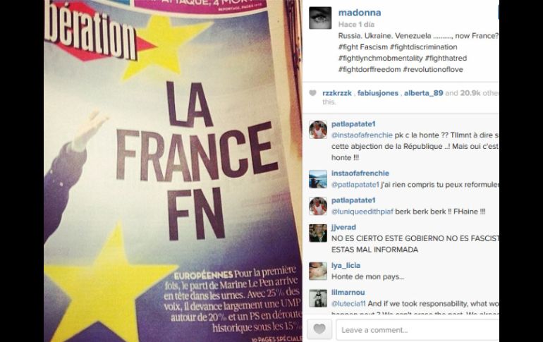 Entretenimiento | Los comentarios de la cantante contra la política de Francia han causado polémica Madonna, contra la ultraderecha francesa Los comentarios de la cantante contra la política de Francia han causado polémica Por: EFE 3 de junio de 2014 - 11:13 hs Madonna utiliza sus redes sociales para mostrar su descontento. ESPECIAL / PARÍS, FRANCIA (03/JUN/2014).- El comentario de la cantante norteamericana Madonna en su cuentas de Twitter e Instagram, donde pidió una reacción a la victoria del partido ultraderechista francés Frente Nacional (FN) en las pasadas elecciones europeas, ha provocado la reacción de su vicepresidente, Florian Philippot, contra la artista. "Rusia, Ucrania, Venezuela ¿y ahora Francia? Combatamos el fascismo, combatamos las discriminaciones", publicó el lunes Madonna, junto a una portada del diario francés "Libération" dedicada a la victoria en Francia del partido de Marine Le-Pen en los comicios europeos del 25 de mayo. "En política también, Mamy Gaga está para el arrastre #Madonna" y "Madonna imita a Yannick Noah: ¡fin de carrera complicada!", fueron las respuestas de Philippot en su cuenta de Twitter. La última es una alusión a la polémica con el ex tenista y ahora cantante Yannick Noah, que tuvo un enfrentamiento con el FN, tras declarar sentirse "insultado" por el resultado de las elecciones, en una entrevista concedida a la televisión de noticias "BFMTV". "No puedo sentir empatía por una persona racista, homófoba o antisemita", explicó el artista, que ya tuvo otro choque con el partido de ultraderecha a causa de una canción en la que se refiere al FN con la frase "Mi enfado no es un frente, ni es nacional (...) tiene todo el honor de combatir la suya." La respuesta por parte del FN a las declaraciones de Noah vino de la mano de su director para la juventud, Julien Rochedy, que dijo que Noah "se siente insultado por la democracia", en una entrevista a "Europe 1". Otro artista que tuvo recientemente un enganche con el FN es el cantante Benjamin Biolay, que publicó en línea el miércoles pasado una canción titulada "El vuelo negro", tomando como referencia "El Canto de los Partisanos", himno de la resistencia francesa escrito en 1943. La canción comienza con la frase "Vamos hijos de la patria", primera estrofa del himno de Francia, un país que dice que "se cae de culo". Biolay describe el "vuelo negro del cuervo sobre la llanura", en referencia a los que llama "mentirosos patológicos profesionales". El escritor Bernard-Henry Levy es otra de las personalidades que ha mostrado su contrariedad ante el éxito del partido de Marine Le Pen, en un llamamiento "por un gobierno de unión nacional" frente a "la extrema derecha triunfante". Temas Farándula Francia Madonna Cantantes Redes Sociales Lee También Ángel Covarrubias, la voz infantil que conquistó Zapopan Bad Bunny permanece sentado durante "God Bless America" y enciende las redes Alcalde de Tulum anuncia acceso libre a playas, pero sin alimentos ni bebidas Belinda denuncia a Lupillo Rivera Recibe las últimas noticias en tu e-mail Todo lo que necesitas saber para comenzar tu día Registrarse implica aceptar los Términos y Condiciones