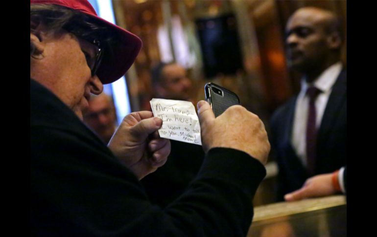 NUEVA YORK, ESTADOS UNIDOS (12/NOV/2016).- El cineasta Michael Moore entró hoy en el edificio Trump Tower de Manhattan para intentar hablar con el presidente electo, Donald Trump, pero los servicios secretos le impidieron subir hasta las oficinas del magnate neoyorquino."Señor Trump. Estoy aquí, quiero hablar con usted", escribió el polémico director en una breve nota que pudo entregar al portero del edificio, durante una protesta en la que participaron cientos de personas frente al rascacielos del empresario.Moore, que grabó la escena con su teléfono móvil retransmitida en directo a través de Facebook Live, logró acceder hasta el interior del edificio y subir por las escaleras mecánicas hasta llegar a la cuarta planta.Fue entonces cuando agentes de los servicios secretos frenaron el paso al cineasta y le indicaron que no podía subirse al ascensor que conduce a las plantas altas del rascacielos donde Trump seguía hoy reunido con sus principales asesores."No queremos que la policía nos expulse. Hay una protesta, pero está siendo en la calle. Pensé que a lo mejor podía entrar en la Trump Tower y subir por las famosas escaleras mecánicas", se oye decir a Moore durante la grabación.En otro momento, asegura que el Colegio Electoral debería ser eliminado porque es "irónico" que 240 años después de su creación "para apaciguar a los dueños de esclavos", ahora un "racista" vaya a ser el presidente "sin haber obtenido la mayoría del voto popular"."Vamos a ver qué pasa, a lo mejor me dejan subir a sus oficinas", insiste el cineasta, quien recordó que la semana pasada ya estuvo en la Trump Tower y ese día sí pudo hablar con la jefa de campaña del entonces candidato republicano, Kellyanne Conway, "y todo fue bien".El rascacielos, donde vive y tiene sus oficinas Donald Trump, sigue este sábado rodeado por especiales medidas de seguridad desde el pasado jueves, después de las manifestaciones que tuvieron lugar en Nueva York el miércoles por la noche.Después de abandonar el edificio, Moore siguió grabando durante más de media hora imágenes de los cientos de personas que seguían este fin de semana protestando contra la victoria de Trump, bajo la atenta mirada de la policía.Unas semanas antes de las elecciones del pasado 8 de noviembre, el polémico director estrenó por sorpresa la película "Michael Moore in TrumpLand", que gira en torno al magnate y que se basa en una obra de teatro escrita por el propio Moore.En la cinta, el ganador de un Óscar al mejor documental en 2003 por "Bowling for Columbine", se adentra directamente en "territorio hostil" en el corazón de la "tierra de Trump" poco antes de las presidenciales.Moore fue uno de los más de un centenar de músicos y artistas, en su mayoría del mundo de Hollywood, que durante la campaña firmaron un manifiesto titulado "United Against Hate" ("Unidos Contra el Odio") para evitar que Donald Trump llegara a la Casa Blanca."Debemos usar los medios a nuestro alcance para alertar sobre los peligros de una presidencia de Trump. Quiere devolver al país a una época en la que el miedo justificaba la violencia, la codicia alimentaba la discriminación", aseguraban el manifiesto.