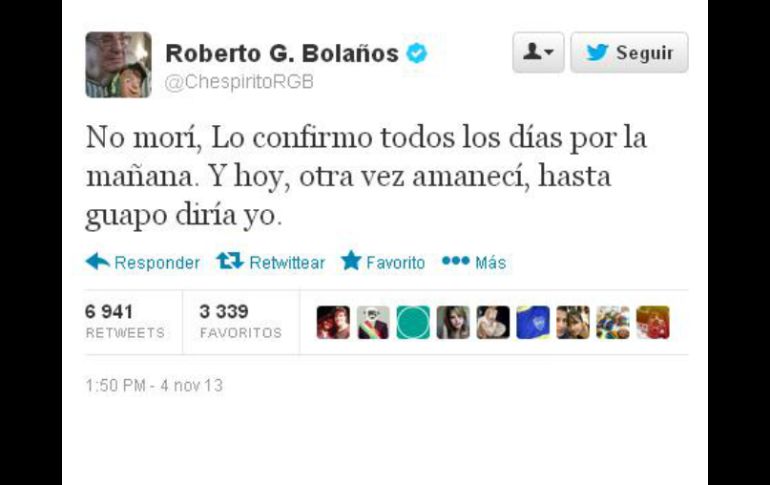 Entretenimiento | El cómico cierra las especulaciones sobre su estado de salud a través de Twitter ''No morí. Hoy, otra vez amanecí'', señala 'Chespirito' El cómico cierra las especulaciones sobre su estado de salud a través de Twitter Por: SUN 5 de noviembre de 2013 - 16:12 hs El cómico envió un tuit en el que aclara su estado de salud. ESPECIAL / CIUDAD DE MÉXICO (05/NOV/2013).- Después de algunas especulaciones sobre el estado de salud de Roberto Gómez Bolaños, “Chespirito”, el cómico mexicano escribió algunas palabras en una red social para dejar claro que sigue con vida. "No morí. Lo confirmo todos los días por la mañana. Y hoy, otra vez amanecí, hasta guapo diría yo", refirió a sus más de cinco millones de seguidores de su cuenta oficial y también se dio tiempo para retuitear acerca de una de sus pasiones que es el futbol. Ante los rumores de su "grave" estado y hasta su "muerte" optó por despejar dudas él mismo en un mensaje que recibió más de seis mil retuits y varias respuestas en automático, pese a que anteriormente Edgar Vivar declarara que todo estaba bien. Temas Farándula Roberto Gómez Bolaños Chespirito Recibe las últimas noticias en tu e-mail Todo lo que necesitas saber para comenzar tu día Registrarse implica aceptar los Términos y Condiciones