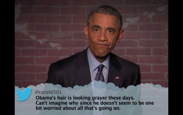 Entretenimiento | En la emisión aborda algunos problemas que ha tenido su gobierno Obama lee tuits odiosos con Jimmy Kimmel En la emisión aborda algunos problemas que ha tenido su gobierno como los recientes actos violentos en Ferguson Por: EL INFORMADOR 13 de marzo de 2015 - 14:28 hs GUADALAJARA, JALISCO (13/MAR/2015).- El presidente de Estados Unidos, Barack Obama, hizo una aparición en el programa de televisión “Jimmy Kimmel Live” de la cadena estadounidense ABC. En la emisión habló sobre algunos problemas que ha enfrentado su gobierno como en los más recientes casos de violencia en Ferguson. Luego de esto, participó en uno de los famosos segmentos del show. El programa cuenta con una sección conocida como “Mean Tweets” en el que celebridades del cine, la música y deportes leen tuits odiosos que los usuarios de la red social publican en contra de ellos. Es así que el presidente tomó asiento y en un celular comenzó a leer los mensajes en su contra. Los mensajes hablaban sobre la situación política del país y tenían publicaciones como “El cabello de Obama está más canoso estos días. No puedo imaginar por qué, si parece que no se preocupa de lo que está sucediendo” o “¿Hay alguna manera de lanzar a Obama a algún campo de golf alrededor del mundo y sólo dejarlo ahí?”, a lo que el mandatario contestó irónicamente “Pienso que es es una excelente idea”. También le reclamaron por el precio de la cerveza con un mensaje que decía: “Un six de Coors Light está ahora a 23 dólares en las tiendas. Gracias, Obama”. Otro mensaje criticaba sus orejas: “¿Cómo hacer que los ojos de Obama se enciendan? Metiendo una linterna en sus orejas”, mensaje que fue recibido con una risa del presidente y con la respuesta “este es muy bueno”. “Alguien mande a Obama algunos consejos para ser un buen presidente. Creo que eso funcionaría”, fue otro mensaje leído por el mandatario quien finalizó con una crítica hacia sus jeans: “Estoy bien con el Presidente usando jeans. Con lo que no estoy bien es con el presidente usando ESOS jeans”, escribió un usuario más, momentos antes de que apareciera Jimmy Kimmel usando el mismo modelo de jeans que Obama, lo que hizo que el presidente respondiera “creo que ellos tienen razón”. Temas Farándula Televisión Estados Unidos Barack Obama Jimmy Kimmel Lee También ¿Dónde ver EN VIVO el partido de J13 Cruz Azul vs América? Así afectarán a México los frentes fríos este fin de semana EU detiene a un palestino por los atentados del 7 de octubre en Israel ¿Dónde ver EN VIVO el partido de J13 Chivas vs Mazatlán? Recibe las últimas noticias en tu e-mail Todo lo que necesitas saber para comenzar tu día Registrarse implica aceptar los Términos y Condiciones
