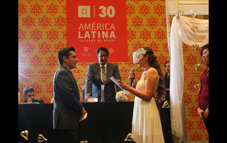GUADALAJARA, JALISCO (30/NOV/2016).- Como grandes lectores, Héctor Ortiz Martínez y Gabriela Inés Jiménez Murguía cumplieron su sueño de unirse en matrimonio en uno de los salones de la FIL, convirtiéndose así en el primer enlace que ocurre en el festival, el más importante del libro hispano.En un espacio debidamente decorado en el Salón 1 de la Feria Internacional del Libro (FIL), y acompañados por amigos y familiares, los contrayentes escucharon con atención al juez quien finalmente los declaró marido y mujer.Como asiduos visitantes de la FIL y para mostrar que la lectura es parte de sus vidas, al término de la ceremonia Gabriela leyó en voz alta el poema "Asunción de ti" de Mario Benedetti, mientras que Héctor le dedicó una parábola del novelista Kahlil Gibran.Para sellar su unión, los novios realizaron el ritual "Símbolo de la Arena" y en dos recipientes que fueron llenando con arena que representaba por grano cada uno de los acontecimientos que vivirán a partir de esta nueva etapa de la pareja, todo en base al amor.La idea del ritual es que con la aportación simbólica de cada grano de arena que depositan ambos en el recipiente sea lo que los haga perdurar como matrimonio para siempre, unidos por el amor, el respeto y la complicidad.En entrevista posterior, los novios aseguraron que debido a su gran amor por los libros tuvieron la idea de enviar un correo electrónico a la FIL de que los dejaran casarse en el marco de esta gran fiesta librera, y para su beneplácito la respuesta fue sí."Nos ayudaron en todo, se han portado muy bien con nosotros y estamos muy agradecidos", afirmó Héctor, quien señaló que para ellos es muy significativo el hecho de sellar su amor en la Feria del Libro, luego de que conservan grandes recuerdos en cada uno de los espacios de la FIL.Gabriela, de Colima, y Héctor del estado de Oaxaca, indicaron que el primer viaje que realizaron juntos fue a la FIL hace ya casi una década, y posteriormente siempre venían a los pasillos de la feria en búsqueda de libros y nuevas experiencias, de tal forma que unirse aquí en algo simbólico para ellos.