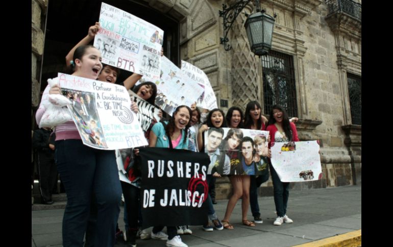 "¡Queremos que Aristóteles nos escuche! Hemos gastado mucho en la manifestación, mil 600 folletos de publicidad y más de dos mil pulseras, de verdad es nuestro sueño (que toquen en Guadalajara) sea gratis o aunque paguemos", dice el jovencito que es acompañado por su mamá, la señora, María de Jesús, que opina que Big Time Rush es un grupo sano, "no está metidos en drogas ni en nada"."Mi mamá también es 'Rusher', le encanta la canción "We are" y no se pierde ninguno de sus programas", explica César mientras sostiene su pancarta exigiendo que el grupo llegue con su tour "Live" a tierra tapatía.Aunque convocaron a 400 personas por Facebook, sólo llegaron los más fieles, Adanely de 20 años y presidenta del club de fans "Rushers de Jalisco", dice que la mayoría no fue porque están por salir a la Ciudad de México y llegar a tiempo al show de mañana."Hemos mandando mensajes a Sony Music y nos dijeron que nos podrían ayudar pero exactamente ellos no los traen, estuvimos hablando con OCESA pero a ellos no les corresponde, hablamos con varias personas y canales de televisión, Exa y Planeta (estaciones de radio) nos apoyaron, ahora hacemos esta protesta para nos pongan atención".Los policías que vigilan el recinto frente a Plaza de Armas no tomaban importancia a los gritos de los jovencitos, uno que otro transeúnte gritaba "¡Arriba One Direction!" para hacerlos rabiar, ellos aunque pocos, seguían con la fe bien puesta exclamando porque Big Time Rush llegue a Guadalajara.¿Quién es Big Time Rush?La agrupación surgió en 2009 a partir de una serie de televisión que llevaba el mismo nombre, fue realizada por el canal Nickelodeon. Kendall Schmidt, James Maslow, Logan Henderson, y Carlos Pena Jr. conforman el grupo. Su primer álbum salió en 2010 con el nombre de "B.T.R.", su segundo disco "Elevate" se presentó en 2011 y ahora promocionan "24/Seven".