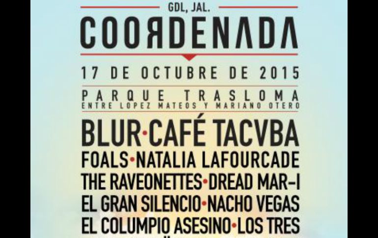 Entretenimiento | Blur encabeza la segunda edición del festival, que tendrá lugar el 17 de octubre Revelan cartel del Festival Coordenada 2015 La banda británica Blur encabeza la segunda edición del festival, que tendrá lugar el 17 de octubre Por: EL INFORMADOR 29 de junio de 2015 - 11:33 hs GUADALAJARA, JALISCO (29/JUN/2015).- Un festival cuya primera edición dejó satisfechos a los tapatíos regresa este próximo sábado 17 de octubre en las instalaciones del Parque Trasloma. Organizado en conjunto por Ocesa y Cultura UdeG, el Coordenada 2015 tiene como cabezas de cartel a los ingleses de Blur, quienes pisarán tierras jaliscienses por primera vez, luego de la presentación que tendrán en la Ciudad de México. Blur llega con The Magic Whip bajo el brazo, el esperado disco recién salido y que marcó el regreso del grupo después de doce años de su último álbum (Think Tank, de 2003). Además del britpop de Blur, el cartel está conformado por música de variados géneros que van desde el rock, el ska, la música gitana y la fusión. En el rubro de bandas internacionales están Foals, Los Tres, Nacho Vegas, Dread Mar-I, Elsa y Elmar, El Columpio Asesino, Taraf de Haïdouks, The Raveonettes y Mon Laferte. En cuanto a las propuestas nacionales, el cartel está lidereado por Café Tacvba, sumando a El Gran Silencio, Little Jesus, División Minúscula, Los Victorios, Presidente, Leiden, Descartes a Kant, Natalia Lafourcade y Rebel Cats. El formato del festival cambiará: el año pasado hubo dos grandes escenarios, mientras que para esta edición se sumará un tercer escenario ubicado en una carpa. Ahí se presentarán grupos emergentes. Igor Lozada, titular de Cultura UdeG, comentó que la presencia de grupos emergentes como Leiden o Descartes a Kant es el resultado de los showcases de FiM Pro, realizados el año pasado. Radar FiM hizo un seguimiento de los grupos, y entre ellos seleccionaron a ambos para presentarse en el Festival Coordenada. El reacomodo del espacio para dar cabida al tercer escenario no va a interferir en las atracciones que el festival ofreció: un área para firma de autógrafos, puestos de comidas y bebidas, venta de mercancía, entre otros. Jordi Puig, coordinador del festival en representación de Ocesa, comentó: 'Nos encantó el festival (el año pasado), sentimos que sembramos algo'. SABER MÁS Coordenada, sábado 17 de octubre. Los precios en la primera etapa son de 610 pesos (más servicio, de venta en Ticketmaster). El precio irá subiendo según avancen las etapas, con el tope en los 800 pesos. Los boletos estarán a la venta desde este próximo jueves. EL INFORMADOR / JORGE PÉREZ Temas Música Conciertos Ocesa Café Tacvba El Gran Silencio Natalia Lafourcade División Minúscula Lee También Tecate Pal Norte 2026: Estas son las fechas y sede t.A.T.u anuncia concierto en México: precio de boletos y cuándo salen a la venta Angélica Vale, viral por decir que "ningún latino puede pagar" para ir al Super Bowl Ticketmaster tiene todos estos conciertos al 2x1 en Monterrey Recibe las últimas noticias en tu e-mail Todo lo que necesitas saber para comenzar tu día Registrarse implica aceptar los Términos y Condiciones