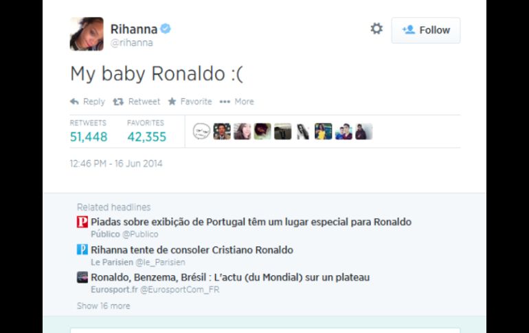Entretenimiento | La cantante ha demostrado ser una fiel seguidora de la Copa del Mundo Rihanna 'coquetea' con jugadores del Mundial La cantante ha demostrado ser una fiel seguidora de todo lo que ocurre en los juegos de la Copa del Mundo Por: SUN 24 de junio de 2014 - 13:04 hs Uno de los ´tuits´ de apoyo a Ronaldo, cuando fueron goleados ante Alemania. FOTO: @rihanna. ESPECIAL / CIUDAD DE MÉXICO (24/JUN/2014).- Bien dicen que hay un público femenino que disfruta de mirar los partidos del Mundial y no precisamente por el juego. Trascendió que Rihanna se ha vuelto una apasionada del Mundial Brasil 2014 por estar viendo las piernas y los cuerpos de los jugadores, incluso, hasta se porta muy cariñosa con ellos vía Twitter, pero la novia de uno de éstos ya le puso el alto. Y es que la morena se ha vuelto la comentarista estrella de la justa, pues sus expresiones dan mucho qué pensar, sobre todo cuando los ha hecho hacia futbolistas como Cristiano Ronaldo, Boateng y Luis Suárez. Ejemplo de ellos, tras la goleada de Alemania a Portugal, la intérprete no dudó en consolar a su amigo Cristiano Ronaldo, al que llamó “mi bebé Ronaldo” en la red social. Pero el verdadero problema surgió cuando publicó un tuit de apoyo al jugador del Schalke y seleccionado de Ghana, Prince Boateng, junto a una foto de ambos. En respuesta, la mujer de La Bestia, Melissa Satta, publicó un par de fotos con un brazalete de Ghana y un tatuaje de amor dedicado a su marido, como diciendo de manera subliminal ¡No mires a mi hombre! En lo que respecta a Ronaldo, personas en las redes sociales comentaron los tweets cargados de indirectas hacia el delantero. Asimismo las preguntas salieron: ¿Qué pasa con Irina Shayk? Cuando suenan campanas de boda y parece que ha sido la única que ha enderezado al futbolista, llega Rihanna a deshacer todo. Temas Farándula Rihanna Twitter Mundial Brasil 2014 Lee También Mbappé brilla en su regreso a París Fallece Junior Dutra al realizarse cirugía estética en manos de dentista sin licencia México busca frenar el paso perfecto de Argentina en Mundial Sub-20 Lista actualizada de selecciones que ya clasificaron al Mundial 2026 Recibe las últimas noticias en tu e-mail Todo lo que necesitas saber para comenzar tu día Registrarse implica aceptar los Términos y Condiciones