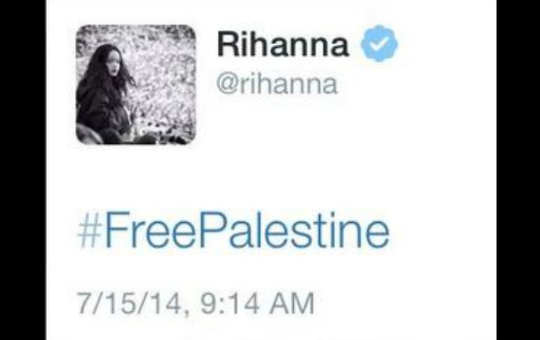 Entretenimiento | La cantante publica un tuit sobre este suceso, el cual borró ocho minutos después Rihanna se enreda con el conflicto Palestina-Israel La cantante publica un tuit sobre este suceso, el cual borró ocho minutos después Por: SUN 16 de julio de 2014 - 07:59 hs Este es el mensaje que la artista eliminó de su cuenta. ESPECIAL / CIUDAD DE MÉXICO (16/JUL/2014).- Rihanna asegura que el mensaje de twitter en el que pedía la liberación de Palestina fue un error. La mañana de este martes la cantante publicó en su cuenta el hashtag #FreePalestine, pero ocho minutos después lo borró tras haber recibido duras críticas de los usuarios. “Nunca fue su intención publicar ese mensaje”, dijo un amigo de Rihanna al portal TMZ. Enseguida, la barbadense publicó otro mensaje en el que pide que llegue la paz para resolver el conflicto entre Palestina e Israel, el cual tuvo ayer otro día álgido ya que el brazo armado de Hamás rechazó el alto el fuego propuesto por Egipto. Temas Farándula Cantantes Rihanna Twitter Escándalos en redes sociales Lee También WhatsApp prepara uno de los mayores cambios en su historia reciente La Granja VIP: Lolita Cortés sorprende con respuesta indiferente a la llegada de Sandra Itzel Concierto de "El Tri" se suspende un momento por caída de una pantalla (VIDEO) Lupillo Rivera, en la mira de la “Ley Olimpia” Recibe las últimas noticias en tu e-mail Todo lo que necesitas saber para comenzar tu día Registrarse implica aceptar los Términos y Condiciones