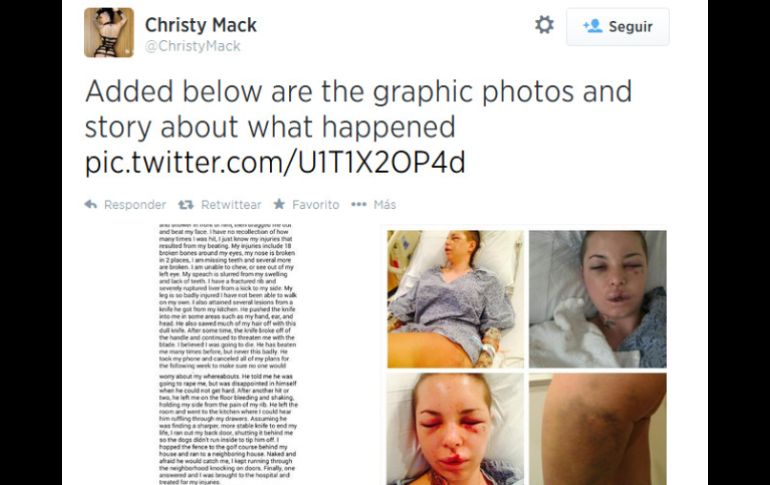 Entretenimiento | Christy Mack publica en Twitter la golpiza que le propinó su ex novio, Jon Koppenhaver Sexy actriz exhibe golpiza sufrida por su ex novio luchador La actriz porno, Christy Mack publica en Twitter la golpiza que le propinó su ex novio, el luchador Jon Koppenhaver Por: EL INFORMADOR 13 de agosto de 2014 - 11:39 hs 'Me hizo desvestirme y ducharme enfrente de él, luego me arrastró hacia afuera', declara Mack. ESPECIAL / GUADALAJARA, JALISCO (13/AGO/2014).- La actriz porno, Christy Mack publicó a través de su cuenta de Twitter la golpiza que le propinó su ex novio, el luchador Jon Koppenhaver, mejor conocido como 'War Machine' el pasado viernes, luego de que éste la sorprendiera con un hombre en su departamento. La actriz compartió un comunicado en el que explica que el pasado viernes, alrededor de las dos de la mañana, Jon Koppenhaver (con quien terminó en mayo pasado) llegó a su departamento mientras ella se encontraba acompañada de un amigo quien estaba vestido y desarmado, sin motivo aparente y sin decir alguna palabra, Jon Koppenhaver comenzó a golpearlo y cuando terminó, siguió con ella. "Me hizo desvestirme y ducharme enfrente de él, luego me arrastró hacia afuera y me golpeó la cara. No recuerdo cuántas veces" comentó la actriz quien resultó con 18 roturas de hueso, incluyendo la nariz y una costilla, perdió varios dientes y sufrió una lesión grave en el hígado. También perdió parte de su cabello pues el luchador se lo cortó con un cuchillo. Por su parte, se desconoce hasta el momento el paradero de "War Machine", sin embargo él ha utilizado también su cuenta de Twitter para decir: " Nunca me creerán". "Hubiera deseado que ese hombre no estuviera ahí y que hubiera logrado comprometerse con mi pareja". "Los policías nunca me darán un juego justo, nunca me creerán. Todavía estoy decidiendo qué haré". Autoridades ofrecen diez mil dólares para encontrarlo. EL INFORMADOR / CAROLINA QUINTANILLA Temas Farándula Actor- Actriz Twitter Escándalos en redes sociales Lee También Restaurante "El Atracadero" reaparece en Veracruz tras viajar 300 km (VIDEO) Ella es La Bea, concursante de "La Granja VIP", que está generando revuelo Vinicius Jr enfrenta proceso judicial por fiesta de cumpleaños ¿Eres tú, Jorge Campos? Filtran cómo sería el jersey de portero del Tri para Mundial 2026 Recibe las últimas noticias en tu e-mail Todo lo que necesitas saber para comenzar tu día Registrarse implica aceptar los Términos y Condiciones