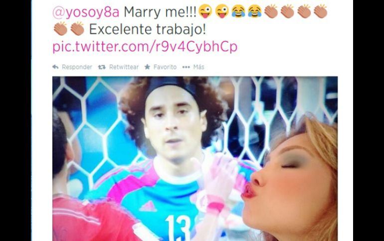 Entretenimiento | La actriz publicó en Twitter una fotografía besando la imagen del guardameta mexicano Thalía le pide matrimonio a Guillermo Ochoa La actriz publicó en Twitter una fotografía besando la imagen del guardameta mexicano Por: SUN 18 de junio de 2014 - 15:40 hs El tuit hasta el momento tiene más de 800 favoritos. ESPECIAL / CIUDAD DE MÉXICO (18/JUN/2014).- El empate y el punto que consiguió ayer martes la Selección Mexicana ante su similar de Brasil en la Copa del Mundo fue motivo de celebración en México, pues aunque no se haya ganado, el equipo tricolor demostró estar a la altura de grandes selecciones. La actriz y cantante Thalía fue una de las celebridades que lo festejó con emoción y publicó algunas imágenes en referencia al mejor jugador del partido, según la FIFA. Ella vio el partido desde su estudio de grabación y posteó por medio de sus cuentas en redes sociales: “La emoción de este partido#fifaworldcup2014 #vivamexico #vamosmexico ajuuua”, escribió en apoyo a la selección. En otra imagen se le ve besando la pantalla en donde aparece Memo Ochoa y le pide matrimonio: "Marry me!!!Excelente trabajo!". Temas Farándula Guillermo Ochoa Thalía Twitter Lee También Sociales: Che Eguiarte 40’s party IberoMedia Global realiza su primer Encuentro Empresarial Internacional Sociales: Domingo en los toros, concluye la primera parte de la Temporada Grande 2025 Guillermo del Toro inaugurará el GLAFF 2025 en Los Ángeles con Frankenstein Recibe las últimas noticias en tu e-mail Todo lo que necesitas saber para comenzar tu día Registrarse implica aceptar los Términos y Condiciones