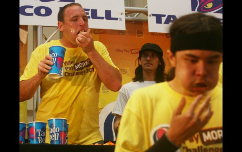 Entretenimiento | También ganó la competencia de comer ''hot dogs'' realizada el pasado 4 de julio Un estadounidense se come 53 tacos en 10 minutos en concurso Joey ''Mandíbulas'' Chestnut se comió hoy 53 tacos en un tiempo récord de 10 minutos Por: EFE 30 de julio de 2011 - 16:42 hs Joey Chestnut (i) come durante el concurso del mejor comedor de tacos de la Liga de comilones profesionales en San Juan. EFE / SAN JUAN, PUERTO RICO (30/JUL/2011).- El estadounidense Joey "Mandíbulas" Chestnut se comió hoy 53 tacos en un tiempo récord de 10 minutos, durante una prueba de comilones de la organización Major League Eating (MLE) celebrada en la capital puertorriqueña. El comilón, que también ganó la competencia de comer ''hot dogs'' realizada el pasado 4 de julio en Estados Unidos, superó a sus compatriotas Timothy Janus y Matt Ftonie, que engulleron cada uno 48, durante una exhibición en el atrio central del centro comercial de Plaza Las Américas de la capital puertorriqueña. La cita contó con una prueba previa para locales en la que los puertorriqueños más hambrientos demostraron su capacidad para engullir tacos. El ganador de la prueba, que se celebró por vez primera en Puerto Rico, ganó cinco mil dólares. Temas Curiosidades y absurdos Alimentos Puerto Rico Lee También Puerto Vallarta es reconocida como la mejor ciudad pequeña de Latinoamérica "Streamer" transmite su parto en vivo y causa revuelo en redes sociales Esta es la última guerra que Trump resolvió, según él mismo Inflación en México se acelera en septiembre; liga dos meses al alza Recibe las últimas noticias en tu e-mail Todo lo que necesitas saber para comenzar tu día Registrarse implica aceptar los Términos y Condiciones