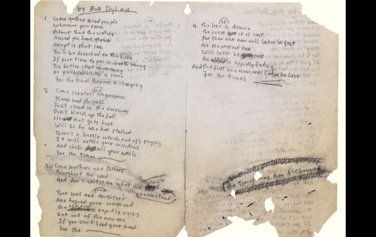 Entretenimiento | Se trata del manuscrito de ‘The Times They are A-Changin’ Venden canción de Bob Dylan en más de 400 mil dólares Cuatro compradores estuvieron compitiendo durante la puja por la letra original y emblemática de Dylan Por: EFE 10 de diciembre de 2010 - 13:40 hs La canción escrita a lápiz en una de la piezas claves de su carrera musical. EFE / NUEVA YORK, ESTADOS UNIDOS (10/DIC/2010).- El manuscrito de la canción "The Times They are A-Changin" del cantautor Bob Dylan, uno de sus temas protesta más conocidos y que fue escrito en 1963, fue vendido hoy por 442 mil 500 dólares durante un subasta que tuvo lugar en Nueva York organizada por Sotheby's. La casa de subastas informó hoy que la hoja de papel en la que Dylan escribió con lápiz la canción, que refleja el momento de cambio que vivía Estados Unidos en la década de los sesenta, logró seducir al coleccionista estadounidense Adam Sender, quien pujó por teléfono superando así el precio que se le había calculado inicialmente al manuscrito, entre 200 mil y 300 mil dólares. Hasta cuatro compradores compitieron durante la puja por la letra original de la canción emblemática de la década de los sesenta, detalló Sotheby's en un comunicado, pero fue finalmente Sender quien logró hacerse con el manuscrito. Uno de los grandes atractivos del original es la firma del cantante, que puede verse en la parte superior de la hoja de papel, así como también el título de la canción, situado en el extremo inferior del manuscrito. El contenido político de "The Times They are A-Changin" convirtió la canción en himno para los grupos de activistas que en la década de los sesenta quisieron llevar a cabo una revolución social en Estados Unidos. La icónica canción, influenciada por las baladas irlandesas y escocesas, ha sido versionada a lo largo de los años por los más diversos artistas, desde Nina Simone hasta Bryan Ferry, pasando por Eddie Vedder, líder de Pearl Jam, y Bruce Springsteen. El primer propietario de la letra de la canción, que también da título al tercer álbum de Dylan, fue Kevin Brown, un amigo del cantante que lo introdujo en el ambiente del Greenwich Village, escenario musical de su primer viaje a Nueva York. De las manos de Brown el manuscrito pasó a las de Eve y Peter Mackenzie, en cuyo apartamento Dylan pasó temporadas componiendo. Sotehby's señaló que Dylan es conocido por no tener demasiado interés en conservar sus manuscritos y aseguró que ha sido gracias a sus anteriores propietarios que el original subastado ha sobrevivido. Temas Música Subastas Bob Dylan Lee También Nominados de los MAMA Awards 2025 y cómo votar por tu favorito Alfredo Olivas en La México: ¿cuánto tiempo es la fila de espera para comprar boletos? Silvana Estrada, cantante veracruzana, anuncia su nuevo álbum de estudio Fiestas de Octubre 2025: cartelera por fecha en el Auditorio Benito Juárez Recibe las últimas noticias en tu e-mail Todo lo que necesitas saber para comenzar tu día Registrarse implica aceptar los Términos y Condiciones