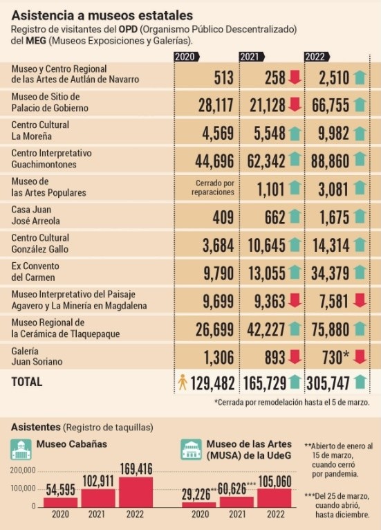 Luego de la pandemia por el COVID-19, que supuso desafíos no vistos con anterioridad, los museos de Jalisco han experimentado una recuperación constatable en sus cifras de visitas, pues de acuerdo con el Organismo Público Descentralizado (OPD) de Museos, Exposiciones y Galerías (MEG) del Gobierno estatal, de 2020 a 2022 éstas aumentaron en el total de recintos de 84 mil 776 a 305 mil 774, casi cuatro veces; es por eso que, para el futuro, la cuestión es atraer más público y adecuarse a las nuevas herramientas tecnológicas, como son las redes sociales.En estos términos, Susana Chávez Brandon, directora del Museo Cabañas, señala que esta administración “atípica” no desestima hacer reajustes para “seguir adelante”, pero siempre han buscado “pensar de otra forma las funciones de un museo y sus formas de trabajo”, porque se trata de “un modelo que ya no se ajusta a la sociedad contemporánea, pues las audiencias buscan otra clase de espacios”, de ahí que “todos somos parte de una comunidad y lo que intentamos es atraer la mayor cantidad de público posible”.La idea anterior conecta con la opinión de la directora del Museo de las Artes (MUSA) de la Universidad de Guadalajara (UdeG), Maribel Arteaga, quien habla de “compartir el concepto de un museo ‘vivo’, es decir, que el público se involucre directamente en el recinto con nuestras activaciones”, ya que los visitantes “han sido desde siempre parte activa en el diseño de la oferta del museo”, lo que significa hacer uso de redes sociales para “propiciar nuevos contenidos” para continuar “conectados con la gente, impulsar públicos nuevos y ser accesibles a la comunidad”.De esta forma, la titular del OPD del MEG, Miriam Villaseñor, destaca que para conseguir estos objetivos, desde 2020 han “trabajado con una visión compartida entre todos los miembros del equipo, y no hay duda que los museos -en especial tras la pandemia- deben estar abiertos al diálogo”. Jalisco registró una asistencia de 647 mil 175 visitantes, según los resultados de la Estadística de Museos 2021 que publicó el Instituto Nacional de Estadística y Geografía (INEGI). El Estado se ubica detrás de la Ciudad de México, Nuevo León y Guanajuato que concentraron el 58.2% del total de visitantes; estas Entidades recibieron, cada una, una afluencia superior al millón de usuarios. Las estadísticas del 2022 serán dadas a conocer en mayo de 2023. Actualmente, en las tierras jaliscienses existen 76 museos, según los últimos datos del Instituto de Información Estadística y Geográfica (IIEG) de Jalisco.Tras la apertura de los recintos culturales que cerraron por la contingencia sanitaria, ahora el reto para los directores y otros funcionarios involucrados con los museos en Jalisco es crear estrategias que permitan atraer más público y ofrecer un mejor servicio; y es en este punto que las cabezas de los museos de Jalisco se encuentran trabajando para registrar las fortalezas y debilidades de cada recinto y con ello planear un mejor futuro, tal y como lo está haciendo el Organismo Público Descentralizado (OPD) de Museos, Exposiciones y Galerías (MEG) de la Secretaría de Cultura (SC) de Jalisco.Cabe señalar que poco tiempo después de que la dependencia encargada de los museos en el esquema de la SC estatal se convirtiera en un OPD, la pandemia tocó tierra en la entidad con intensidad inesperada; luego Miriam Villaseñor se convirtió en la primera directora del OPD y, en pleno 2020 de la contingencia, tomó el toro por los cuernos.La directora de MEG relata a esta casa editorial que “el hecho de que la mayoría de los espacios estuvieran cerrados por la contingencia, me permitió hacer un levantamiento del estado de cada uno de los museos respecto a la infraestructura, las colecciones, las exposiciones, el personal, y eso lo agradezco pues esa oportunidad permitió un diagnóstico rápido para visualizar por dónde íbamos a empezar”.La funcionaria establece que lo primero que hizo fue “seguir las recomendaciones de la Secretaría de Salud (SSJ), privilegiando las actividades al aire libre, algo que resultó sencillo en el caso de Guachimontones, pues casi todo ahí es al aire libre”. También realizó eventos en el Ex Convento, “se diseñaron actividades para el patio” y en el Museo de Artes Populares (MAP), “se logró —pues estaba cerrado desde antes de la pandemia— reparar los baños y reabrir el espacio”. ¿Qué ventajas representó volverse un OPD? Dice Villaseñor que “lo primero que vi fue que ahora podríamos generar recursos propios y ver que se quedaran al interior del organismo, lo que serviría de ayuda para atacar y resolver con mayor inmediatez algún tema de infraestructura”.Lo anterior, indica la titular del OPD, porque “no hay que olvidar que cerca del 90% de los espacios que están a cargo de la Red de Museos son protegidos, muchas veces presentan problemas de instalaciones: además, crear así una red ayudaba a ponderar las exposiciones (dentro y fuera del Estado) y que el presupuesto se distribuyera en todos los espacios, ya que producir y hacer itinerante una muestra hace más rico a nuestro programa y llegamos a los municipios, que estaban muy olvidados antes de la pandemia”.Por otra parte, continúa Villaseñor, ser OPD “ayuda a optimizar los recursos porque tenemos diferentes públicos; no es igual tener una exhibición en el Ex Convento y llevarla después a Autlán, donde el público es tremendamente distinto, pero lo beneficioso es que nos ofrece esto un margen más grande de personas a las cuales estamos llegando”.Sobre este tema, Susana Chávez Brandon, directora de El Museo Cabañas, recuerda que este recinto también es un OPD, sectorizado a la SC estatal, pero su presupuesto se asigna directamente desde la administración central; “es un modelo ventajoso”, comenta la funcionaria, “porque da flexibilidad al permitirnos tener ingresos pro