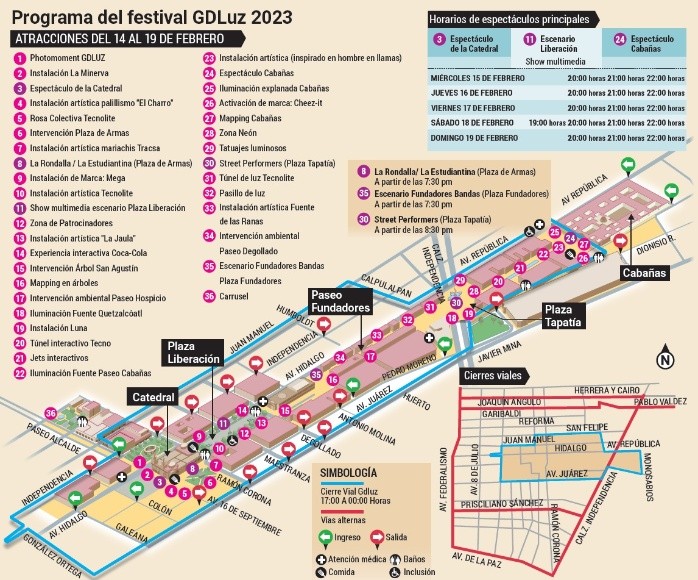 Los tapatíos conmemoraron el 481 aniversario de la fundación de Guadalajara con color, sabor y fiesta. Desde temprano, las calles del Centro Histórico se llenaron de vida y los visitantes se unieron a la celebración.Más tarde, el Ayuntamiento registró la asistencia de unas 300 mil personas al festival GDLuz, que se llevará a cabo hasta el próximo domingo 19 de febrero. Dentro de los festejos hubo guardias de honor en plaza Fundadores y en la Rotonda de los Jaliscienses Ilustres se cantaron “Las Mañanitas” a la capital del Estado. El alcalde Pablo Lemus y el gobernador de Jalisco encabezaron la ceremonia, en la que destacaron la importancia de la ciudad y su papel como referencia de la mexicanidad en todo el mundo. “Estamos señalando cualquier cosa en nuestra ciudad en el ámbito que la podamos mejorar, pero ¡ay de alguien que se le ocurra hablar mal de Guadalajara! Porque la defendemos hasta con las uñas”, dijo Lemus. En el teatro Degollado se ofreció una gala al aire libre a cargo del Mariachi Ciudad de Guadalajara y el Ballet Folclórico Guadalajara. La plaza de Armas fue el escenario de la repartición de mil 200 tejuinos y mil jericallas. La gente hizo filas para probar estas delicias.Por la noche, la plaza de la Liberación albergó el festival GDLuz, que inició con “Las Mañanitas” y la intervención del grupo folclórico Pizintli; enseguida los DJ Renzo Cubas, César Cosío y Arturo de la Torre pusieron el ritmo para cerrar con fuegos pirotécnicos.Desde su silla de ruedas, Yolanda Martínez fue conducida por su marido y ambos siguieron el flujo de la multitud rumbo a la plaza Tapatía: “Yo, antes de andar en la silla, no me perdía ninguno de estos festejos del aniversario de la ciudad, todo lo que hacen, porque todo es muy bonito, desde ‘Las Mañanitas’. Soy de la ciudad y la disfruto”.Debido a que habrá más días de actividades, y los comercios podrán operar hasta la medianoche, este año se espera una derrama superior a los 200 millones de pesos (MDP) con el programa GDLuz, cifra superior a los 80 MDP estimados en 2022.Las actividades del festival comenzaron ayer y se realizarán hasta el próximo 19 de febrero, dos días más que en años anteriores, desde la catedral de Guadalajara hasta el Instituto Cultural Cabañas. La expectativa es de dos millones de visitantes.En días pasados, la coordinadora de Construcción de Comunidad de Guadalajara, Andrea Blanco, informó que el espectáculo de dos kilómetros de recorrido tiene más de 35 atracciones en el Centro Histórico.Mientras que las autoridades municipales remarcaron que en los seis días de actividades se desplegaría un operativo con la participación de mil elementos policiales, así como funcionarios públicos de Protección Civil y el Sistema DIF.Además, se extenderán los horarios del transporte público masivo y los estacionamientos públicos. El Peribús, Macrobús, las líneas del Tren Ligero y del SiTren se extenderán hasta las 00:30 horas, mismo horario que los sitios para dejar los vehículos particulares. Debido a que se buscan que las personas caminen, los ciclopuertos de MiBici Pública serán desactivados.Por otro lado, los ingresos de los visitantes están controlados con siete filtros establecidos en puntos como la avenida República, a la altura del Hospicio Cabañas; la calle Industria y paseo Alcalde; en Hidalgo y Galeana, y Pedro Moreno a la altura de Gerardo Suárez. En los sitios se supervisará que los asistentes no ingresen con armas de fuego o blancas, botellas, estupefacientes, alcohol, entre otros insumos que puedan generar situaciones ajenas a la dinámica del festival.Los funcionarios también precisaron que se tendrán cinco módulos de atención a la ciudadanía con elementos operativos de Servicios Médicos, DIF Guadalajara, Seguridad Pública y Protección Civil y Bomberos en el Jardín Reforma, Plaza de la Liberación, Plaza Tapatía, explanada de Museo Cabañas y portales de Presidencia Municipal. El Ayuntamiento informó que la venta de bebidas alcohólicas será restringida para su consumo al interior de locales comerciales, sin expendio para llevar y se ampliará el horario de apertura de los negocios del Centro Histórico hasta la medianoche, sin requerir un permiso adicional.El alcalde tapatío Pablo Lemus Navarro encabezó ayer por la mañana las celebraciones por el Aniversario 481 de Guadalajara. Primero, se realizaron guardias de honor en plaza Fundadores, con una duración de un minuto en las esculturas de Francisco Tenamaxtli, Miguel de Ibarra y Beatriz Hernández, así como en el friso de plaza Fundadores, ubicado a espaldas del teatro DegolladoPosteriormente, el alcalde en compañía del gobernador del Estado, se trasladó a la Rotonda de los Jaliscienses Ilustres, donde sonaron las tradicionales “Mañanitas” para la ciudad. Acto seguido se realizó una gala al aire libre a cargo del Mariachi Ciudad de Guadalajara y el Grupo Folclórico Pizintli, quienes ofrecieron un programa basado en el barrio de Las 9 Esquinas.“Sí es cierto, somos críticos y estamos señalando cualquier cosa en nuestra ciudad en el ámbito que la podamos mejorar, pero ¡ay de alguien que se le ocurra hablar mal de Guadalajara! Porque la defendemos hasta con las uñas”, remarcó el alcalde tapatío.Por otra parte, el gobernador de Jalisco dijo que “todas y todos entendemos el orgullo de ser tapatíos, los que queremos a nuestra ciudad, lo que nos enorgullece que Guadalajara sea un referente de la idea de la mexicanidad, aquí y en el extranjero”.De acuerdo con el Ayuntamiento tapatío, el programa contempló valses y canciones de principios del siglo XX, sones tradicionales de Jalisco, sones contemporáneos, entre otras melodías con un programa artístico cuya idea original fue de Ismael García Ávila, Director del Ballet Guadalajara.Tras el acto protocolario, se realizó la tradicional partida del picón y posteriormente se ofrecieron cinco mil p