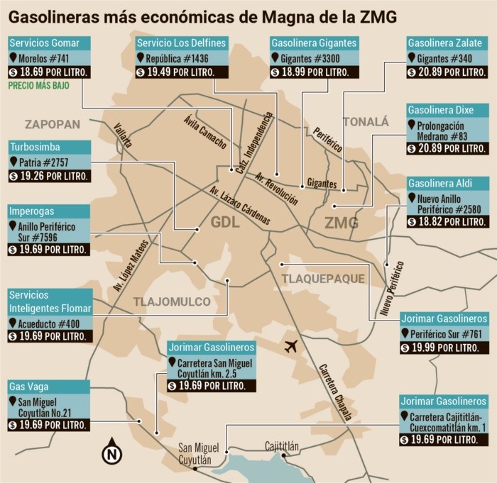 Más de dos pesos es la diferencia que hay entre una gasolinera y otra ubicada en una misma colonia. Por ejemplo, en la zona de Alcalde y Circunvalación operan cuatro estaciones de servicio cercanas, que ofertan a 20.89, 22.59, 22.69 y 22.95 pesos el litro de la Magna; es decir, entre la más barata y la más cara hay una diferencia de 2.06 pesos por litro. “Vengo a esta gasolinera porque le pongo en promedio 40 litros y pago 835 pesos en la estación que está por Alcalde, cerca de la Secretaría de Transporte. Es de las más económicas”, subraya Iván García. Para dimensionar el gasto, en el comparativo con la estación de servicio más cara que se encuentra en esa zona, Iván se ahorra 83 pesos cada vez que carga combustible. “Desconozco por qué es más barata”.Empleados de esas estaciones informan que cada gasolinera vende el combustible de acuerdo con sus gastos de operación. “Al principio, cuando estaba la BP (British Petroleum), la gente se fue para allá porque según eso tenía un aditivo, pero después la gente se dio cuenta de que era más cara: cuando vieron que el rendimiento no era el mismo, regresaron”, explicó Toño, empleado de la estación de Pemex ubicada en Alcalde y Circunvalación. Detalló que no se hacen competencia, ya que los flujos de las calles son diferentes.Carlos Gómez, otro empleado, detalla que lo importante es la calidad del producto, el rendimiento y el buen funcionamiento del vehículo, “se deben fijar en cuánto rinde su coche”.La Asociación Mexicana de Empresarios Gasolineros (Amegas) subraya que el precio del combustible se compone de varios aspectos: el costo de la importación y del traslado, la logística, la molécula y el impuesto. Por ejemplo, las gasolineras en Manzanillo tienen un costo menor porque no pagan los dos pesos que representa la logística, ni pagan el almacenamiento, acentúa Amegas.En la Zona Metropolitana de Guadalajara la gasolina más económica se vende en 19 pesos por litro, de acuerdo con la página de la Comisión Reguladora de Energía (CRE).Según el portal, en la estación de servicio Gigantes, ubicada en Gigantes 3300 en el municipio de Guadalajara, se comercializa a 18.99 pesos por litro.En esta estación, desde temprano se aprecia la fila de automóviles que entran y salen para cargar combustible.En segundo lugar se ubica la estación de servicio Turbosimba, en Patria 2757 esquina Colón, donde se comercializa en 19.26 pesos por litro. En ese mismo precio se vende en la estación Turbosimba, en avenida Cruz del Sur 3680.Servicio Delfines está en República 1436 y la gasolina regular se vende en 19.49 pesos.En el sur de la ciudad, otra estación de servicio, que es de las más socorridas, se ubica en López Mateos, antes de llegar a Bugambilias, también de la marca Kpetrom: se oferta en 19.69 pesos el litro.En las estaciones de servicio que se vende el combustible más económico normalmente están más saturadas que las demás. Tal es el caso de la gasolinera en Gigantes 3300 en Guadalajara, donde los conductores hacen una larga fila para cargar.Otro caso es la ubicada en Mariano Otero y Periférico en Zapopan, que todos los días está llena de vehículos.“Aquí el precio es muy bueno, es más barato que en otras estaciones hasta en cinco pesos, por eso cargo aquí seguido”, dijo Manuel Franco.Por ejemplo, en esta estación, el precio de la gasolina regular se comercializa en 19.69 pesos por litro.“Los precios aquí están bien, yo cargo seguido… es la chida” dijo Óscar Núñez.Armando Reyes es un motociclista que también carga en esta estación 200 pesos de gasolina para su motocicleta. “Yo vengo seguido, sí me rinde la gasolina, se me hace mejor que las otras. Y el precio obviamente es mejor”.Adrián Castro es otro cliente que viene a esta estación porque se vende más barata.“Para mí está más barato que en otras estaciones, eso sí, normalmente cargo 200 pesos y me dura dos a tres días”.Alberto Sánchez es otro automovilista que acude a esta estación por el precio, aunque reconoce que siempre está llena, por lo que debe esperar más tiempo de lo normal.“Yo he escuchado que en algunos casos se han descompuesto los vehículos cuando cargan gasolina barata, pero aquí siempre cargo y nunca he tenido problemas”.Los despachadores explican que, debido al bajo precio, siempre hay mucha clientela, lo que los beneficia, ya que hay más oportunidad de propinas.“Todos los días está muy fluido, a todas horas, viene mucha gente de alrededor y hasta de Tlajomulco”, dijo Ángel, un despachador.Otras estaciones que están saturadas son las ubicadas en avenida López Mateos esquina Nicolás Bravo, antes de llegar a Bugambilias. En la estación SuGaso, en avenida Colón 4501, en la colonia Nueva España, también se hacen largas filas de automovilistas para cargar combustible.GUÍAEl precio promedio de la gasolina regular en Jalisco disminuyó 19 centavos o -0.84% en términos reales en mayo pasado, respecto al mes anterior, al registrar un precio promedio de 22.40 pesos por litro, informó el Instituto de Información Estadística y Geográfica de Jalisco (IIEG). El organismo dijo que en mayo del 2023, el precio de la gasolina regular disminuyó a tasa anual en Jalisco, así como a nivel nacional, ligando seis meses con una variación anual negativa en términos reales. Sin embargo, a tasa mensual acumula un mes a la baja. “A pesos constantes, el precio promedio de mayo del 2023 en Jalisco fue de 22.40 pesos por litro, una diferencia de 46 centavos por litro contra el promedio nacional”, precisó el organismo.Jalisco queda en el lugar 12 a nivel nacional entre las Entidades con mayores precios de la gasolina regular.Por su parte, la gasolina Premium disminuyó 4 centavos en términos reales, al quedar en 24.91 pesos por litro, lo que implica una variación de -0.16%. El precio de la gasolina Premium se ubica por arriba del promedio nacional de 24.23 pesos por li