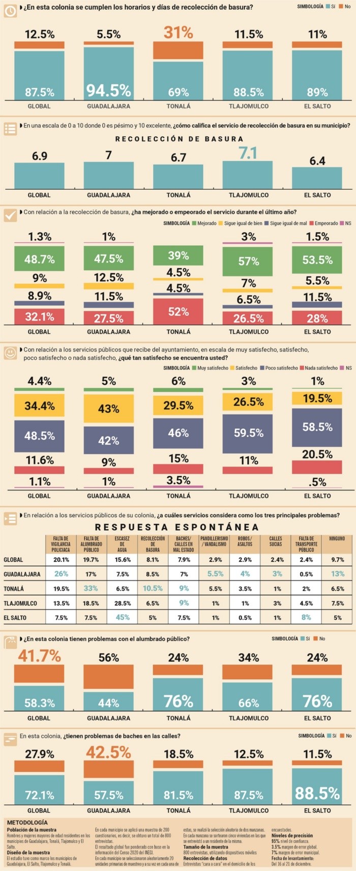 Mientras los Ayuntamientos de Guadalajara, Tlajomulco, Tonalá y El Salto discuten las condiciones que deberá cumplir el nuevo organismo intermunicipal que coordine la recolección de basura, este servicio es el mejor evaluado por los habitantes de la Zona Metropolitana de Guadalajara (ZMG). De acuerdo con la “Evaluación de Servicios Municipales” emprendida por Ice Research, al cierre de diciembre de 2023, la recolección de residuos fue el servicio que mejor calificación obtuvo entre los que ofrecen los Ayuntamientos. “A mí me gusta el servicio de recolección de basura. Antes del mediodía ya pasó el carretón y se llevó mis bolsas. Hasta el sábado pasan. Mis hijos se quejan porque las campanas los levantan antes de las 10, pero yo les digo que es mejor que pasen a que se nos llene de basura la cochera”, dijo Guadalupe, vecina de la Colonia Jardines Alcalde, en Guadalajara. En el promedio, la recolección fue la mejor evaluada con 6.9 puntos, de una calificación máxima de 10. Y en el desglose por municipios, Tlajomulco fue el que mejor puntaje obtuvo (7.1), por encima de atención en los servicios médicos y alumbrado público.Le siguió Guadalajara, que obtuvo 7.0, sólo por debajo del servicio de alumbrado público, que llegó a 7.3, y quedó por arriba de la atención en servicios médicos. “Yo tengo muchos años conociendo al señor que me recoge la basura, son además personas muy amables. Ya más o menos saben qué día salimos a tirar la basura y hasta se acercan a la casa para ayudarnos a sacar las bolsas. Si nos ven que salimos corriendo, el camión nos espera. Yo estoy contenta con el servicio”, compartió Flor, habitante de Colinas de La Normal.*La calificación es el promedio a nivel metropolitano.La recolección y disposición final de los residuos sólidos urbanos son responsabilidades que tienen por cumplir todos y cada uno de los ayuntamientos, de acuerdo con las normas de las Entidades y del país. Para ello deben disponer de los recursos necesarios, propios o a partir de empresas privadas dedicadas a ello, para que los ciudadanos puedan contar con este servicio de manera eficiente y eficaz. En este sentido y de acuerdo con la “Evaluación de Servicios Municipales” emprendida por Ice Research, al cierre de diciembre de 2023, los ciudadanos dieron una alta calificación al cumplimiento de este servicio en los municipios de Guadalajara, Tlajomulco, Tonalá y El Salto, al otorgar un nivel de aprobación de 87.5% en promedio, por considerar que en su colonia se cumplen los horarios y días en los que se ofrece el servicio de recolección de basura. La calificación más alta en este sentido la obtuvo el servicio que se ofrece en el municipio de Guadalajara, con un total de 94.5%, seguido del municipio de El Salto, cuyos ciudadanos otorgaron 89% de aprobación al cumplimiento. En el tercer puesto se encontró Tlajomulco, con una aprobación de 88.5 por ciento. Tonalá fue un caso especial, pues reportó una notable mejoría. Mientras que en el análisis emprendido por Ice Research en noviembre de 2021, los ciudadanos que respondieron a la encuesta le dieron una calificación de 63.5%, en esta ocasión el cumplimiento del servicio subió a 69%, es decir, mejoró en 5.5 por ciento. Lo anterior es el resultado de la encuesta realizada “cara a cara” a 800 personas de Guadalajara, Tlajomulco, Tonalá y El Salto, elegidas de manera aleatoria con base en la información del censo de 2020 del Inegi, estimando una precisión de 95% en los niveles de confianza. El ejercicio se llevó a cabo entre el 16 y el 21 de diciembre de 2023, de acuerdo con Ice Research.GUADALAJARAEl Ayuntamiento de Guadalajara es uno de los pocos que cuenta con una plataforma para que la ciudadanía pueda conocer, en tiempo real, si el camión de la basura ya se encuentra cerca de su domicilio o si este ya pasó y deberá esperar hasta el próximo recorrido. Se trata de la plataforma “Camión de la Basura”, que actualmente se encuentra siendo alimentada con nueva información sobre el municipio, como parte de las mejoras que se llevan a cabo desde la alcaldía para ofrecer un mejor servicio de recolección para los tapatíos.Dentro de las acciones emprendidas para la actualización del sitio, se trabaja en el ajuste del sistema de monitoreo, que busca ser aún más preciso, colonia por colonia, “ya que arrojará en tiempo real el recorrido de todos y cada uno de los camiones que prestan el servicio a partir del GPS con el que cuenta cada uno de ellos”.De acuerdo con la información compartida por el área encargada de dichas labores, la migración del sitio web quedará lista en aproximadamente cuatro semanas, y cuando esto ocurra, se dará a conocer la operación del mismo a los tapatíos a través de los canales oficiales de la alcaldía, aseguró el Ayuntamiento tapatío.Aunque año con año los ayuntamientos emprenden diversas campañas de bacheo para mejorar las condiciones de las calles, para los ciudadanos este es el problema que más les aqueja. De acuerdo con la más reciente Encuesta de Seguridad Pública Urbana (ENSU) del Inegi, dada a conocer ayer, esta fue la “problemática más importante” para 67% de los tapatíos, y para 79% de los ciudadanos de Tonalá, de la misma forma que lo fue para siete de cada 10 tlajomulquenses.“En diciembre, al menos en dos ocasiones tuve que cambiar las llantas de mi vehículo debido a los baches que tenemos en la colonia San Agustín. Siempre hay, pero con las lluvias las calles empeoraron y no las arreglaron. La primera vez tuve que cambiar dos llantas porque se me poncharon y la segunda porque por los mismos baches les salió una bola”, lamentó Héctor, vecino de Tlajomulco.Entre los temas que le siguieron a esta problemática fueron la delincuencia, alumbrado público insuficiente y embotellamientos en las calles y avenidas de la ciudad.Las respuestas coincidieron con los resultados obtenidos en la “Evaluación de S