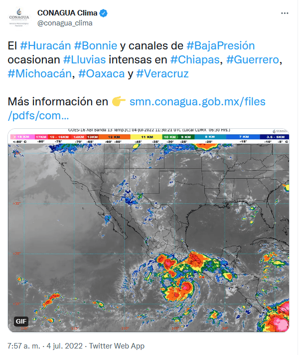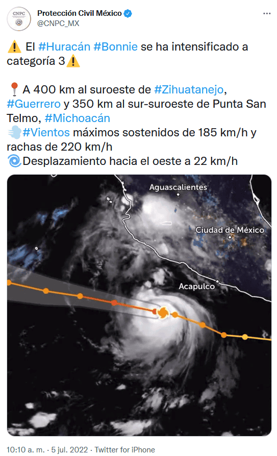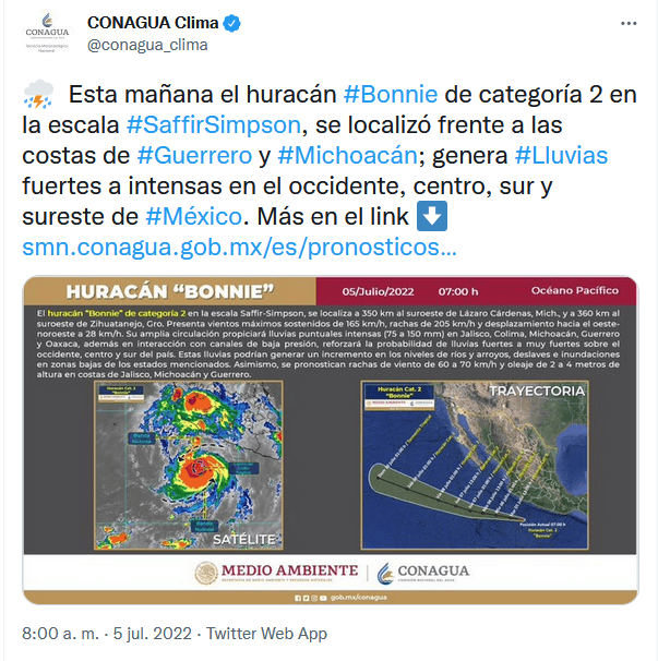 México | Huracán "Bonnie" EN VIVO: Trayectoria y noticias al momento Estas son las actualizaciones, reportes de lluvias, inundaciones y otras afectaciones por "Bonnie" en México Oralia López 6 de julio de 2022 - 08:25 hs Huracán "Bonnie" provocará lluvias en Jalisco 2022-07-06 08:25Aunque el huracán "Bonnie" se debilita gradualmente mientras se aleja de las costas del Pacífico, provocará lluvias en varios estados, entre ellos Jalisco. Las precipitaciones estarán acompañadas de descargas eléctricas y fuertes rachas de viento. "Bonnie" causa oleaje elevado mientras se aleja de costas de México 2022-07-06 07:52El huracán "Bonnie" se debilitó la mañana de este miércoles a categoría 2 tras convertirse en la primera tormenta fuerte de la temporada del Pacífico mexicano, aunque no presenta amenaza a tierra. Meteorólogos prevén que "Bonnie" se adentrará hoy más tarde en el mar. El Centro Nacional de Huracanes de Estados Unidos reportó que causó marea alta en la costa del occidente de México. La Semar cierra puertos en Michoacán y Guerreo por "Bonnie" 2022-07-05 11:35Después de que se informara de la evolución del huracán "Bonnie" a categoría 3 en el Pacífico mexicano, Protección Civil y la Secretaría de Marina (Semar) dieron a conocer el cierre de puertos a embarcaciones menores en Lázaro Cárdenas (Michoacán) y Puerto Marqués (Guerrero). También detalló el cierre a embarcaciones menores a partir de las 18:00 horas de hoy en Manzanillo (Colima); en Salina Cruz (Oaxaca), la suspensión de maniobras en instalaciones y amarraderos costa afuera. Huracán "Bonnie" se intensifica a categoría 3 2022-07-05 09:15En su reporte de las 10:10, la cuenta de la Coordinación Nacional de Protección Civil indicó que el huracán "Bonnie" se intensificó a categoría 3 en la escala Saffir-Simpson. El ciclón se ubica a 400 km al suroeste de Zihuatanejo, Guerrero, y a la 350 km -suroeste de San Telmo, Michoacán. Presenta vientos máximos sostenidos de 185 km/h y rachas de 220 km/h, mientras mantiene un desplazamiento hacia el oeste a 22 km/h. TWITTER "Bonnie" deja lluvias en el occidente de México, incluido Jalisco 2022-07-05 07:25En su reporte de las 07:15 horas de este 5 de julio, el SMN indicó que el centro del huracán "Bonnie" de categoría 2 en la escala Saffir-Simpson, se localiza frente a las costas de Guerrero y Michoacán. Su amplia circulación produce lluvias fuertes a puntuales intensas sobre entidades del occidente, centro, sur y sureste de la República Mexicana, además de fuertes rachas de viento y oleaje elevado en las costas de Jalisco, Michoacán y Guerrero. TWITTER Huracán "Bonnie" se intensifica a categoría 2 al sur de Acapulco 2022-07-04 18:20El huracán "Bonnie", que dejó tres muertos en Centroamérica, subió a categoría 2 en la escala de Saffir-Simpson la tarde del lunes 4 de julio, mientras avanzaba en paralelo a la costa del Pacífico mexicano, informaron el Centro Nacional de Huracanes (NHC) de Estados Unidos y autoridades locales. "Bonnie se intensificó a huracán de categoría 2 en la escala Saffir-Simpson", destacó el Servicio Meteorológico Nacional de México (SMN) en comunicado. Declaran alerta azul por "Bonnie" en varios estados 2022-07-04 11:15La Coordinadora Nacional de Protección Civil indicó una alerta azul por acercamiento del huracán "Bonnie" en el Norte de Colima; el Centro, Este y Noroeste de Guerrero; el Centro, Noroeste y Sureste de Jalisco; y el Sureste de Michoacán. También se alertó por alejamiento en Sur y Suroeste de Oaxaca. Esta alerta se emite ante el peligro muy bajo del fenómeno en las zonas mencionadas. También se implementó alerta verde por acercamiento en el Centro, Sur y Oeste de Colima; el Sur, Sureste y Suroeste de Guerrero; así como el Suroeste de Jalisco y el Sur y Suroeste de Michoacán. Esta alerta se emite ante el peligro bajo. Huracán "Bonnie" sigue desplazándose paralelo a costas de México 2022-07-04 09:55En su reporte de las 10:15 horas, el SMN indicó que la circulación del huracán "Bonnie", de categoría 1 en la escala Saffir-Simpson, produce lluvias fuertes a puntuales intensas sobre entidades del sur y sureste de México, y gradualmente hacia el occidente del país, causando además fuertes rachas de viento y oleaje elevado en las costas de Oaxaca y Guerrero. Explica que "Bonnie" mantiene rápido desplazamiento hacia el oeste-noroeste, paralelo a las costas del Pacífico Mexicano. Huracán "Bonnie" ocasionará lluvias en varios estados 2022-07-04 08:25De acuerdo con el reporte de las 07:00 horas del Servicio Meteorológico Nacional (SMN), el huracán "Bonnie" dejará lluvias, en combinación con canales de baja presión, en Chiapas, Guerrero, Michoacán, Oaxaca y Veracruz. TWITTER Huracán "Bonnie" avanza por la costa del Pacífico mexicano 2022-07-04 08:20El huracán "Bonnie" avanza hoy lunes por las costas del océano Pacífico mexicano, luego de que cruzara Centroamérica desde el Caribe y causar fuertes lluvias, aunque pocos daños. Los meteorólogos prevén que el huracán "Bonnie" se mantendrá en el mar y no amenace tierra firme, ya que se desplaza hacia el noroeste frente a la costa del sur de México. Temas Huracanes Ciclones Lluvias huracán bonnie Estados Conagua Lee También Trump anuncia aranceles del 100% para China por su postura comercial 'hostil' CFE trabaja en restablecer energía a más de 300 mil usuarios tras intensas lluvias ADO suspende servicio en estas ciudades por paso de la tormenta tropical 'Raymond' SMN advierte: Tormenta Raymond dejará lluvias intensas y fuertes vientos en 4 estados