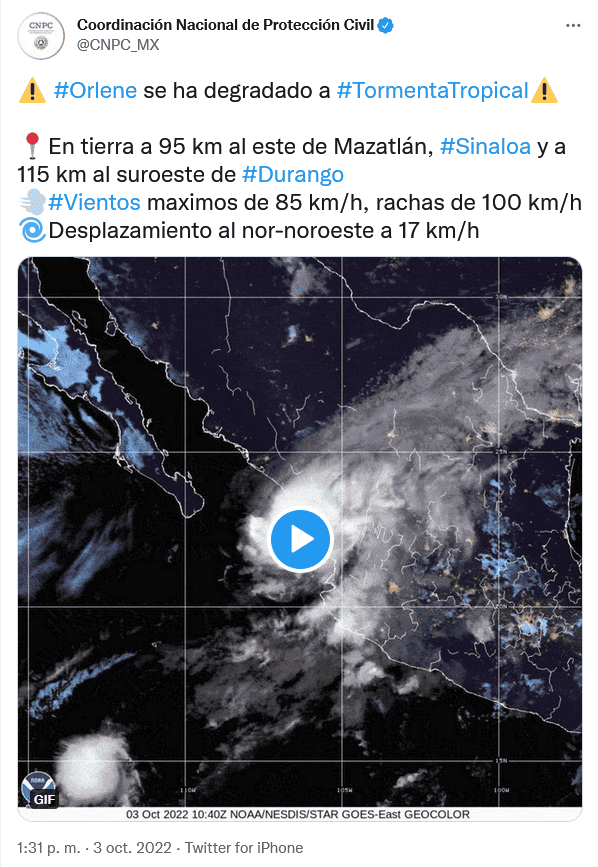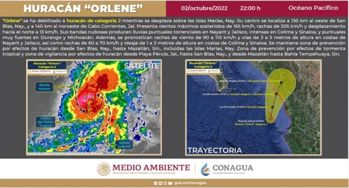 México | Huracán "Orlene" EN VIVO: Trayectoria y noticias al momento Estas son las actualizaciones, reportes de lluvias, inundaciones y otras afectaciones por "Orlene" en México Oralia López 3 de octubre de 2022 - 13:25 hs "Orlene" se grada a Tormenta Tropical 2022-10-03 13:25Tras tocar tierra este lunes en Sinaloa como huracán categoría 1, "Orlene" se degradó a Tormenta Tropical. Se ubica a 95 km al este de Mazatlán, y a 115 km al suroeste de Durango, con vientos máximos de 85 km/h, rachas de 100 km/h Desplazamiento al nor-noroeste a 17 km/h. Emiten alerta roja en Sinaloa y Nayarit por "Orlene" 2022-10-03 11:25Protección Civil informó en sus redes sociales que se emitió una alerta roja por acercamiento del huracán "Orlene" de categoría 1 para el Sur y Centro-Sur de Sinaloa, así como por alejamiento en el Norte de Nayarit. La alerta roja pide mantener en resguardo total a la población y autoridades, así como restringir toda actividad manteniéndose en sesión permanente los consejos estatales y municipales de protección civil, así como las instancias de coordinación y comunicación. También indica reforzar la información por conducto de los medios de comunicación masiva sobre el impacto del fenómeno y la necesidad de permanecer bajo resguardo. ESPECIAL / preparados.gob.mx "Orlene" toca tierra como huracán categoría 1 en Sinaloa 2022-10-03 08:39La Comisión Nacional del Agua (Conagua) informó que "Orlene" tocó tierra a las 08:45 horas de este lunes, a cinco kilómetros al oeste-suroeste de Isla del Bosque, en el municipio de Escuinapa, Sinaloa. "Orlene" ya es huracán categoría 2 2022-10-02 23:28El Huracán "Orlene" se debilitó a categoría 2 y se desplaza sobre las Islas Marías, Nayarit, informó la Comisión Nacional del Agua. La noche del domingo el ciclón se localizó a 130 km al oeste de San Blas, Nayarit y a 140 km al noroeste de Cabo Corrientes, Jalisco. Puerto Vallarta cierra el aeropuerto por el paso del ciclón 2022-10-02 21:50El Grupo Aeroportuario del Pacífico (GAP) confirmó que el Aeropuerto de Puerto Vallarta fue cerrado de manera preventiva debido al huracán "Orlene". Se detalló que la terminal no tiene vuelos desde las 21:00 horas de hoy y será abierto hasta mañana a las 08:00 horas. Hasta el momento han sido cancelados al menos 26 vuelos: 13 llegadas y 13 salidas PC jalisco continúa recorridos preventivos en la costa por "Orlene" 2022-10-02 18:45En sus redes sociales, Protección Civil Jalisco informó que continúa con los recorridos preventivos en zonas de la Región Costa Norte, ante el paso del huracán "Orlene". Exhortan a la población evitar acercarse a las zonas de playa, ya que se están presentando rachas de viento y oleaje alto. En Jalisco, 10 municipios en peligro alto por "Orlene" 2022-10-02 16:08El Gobierno federal informó que hay 10 municipios de Jalisco en alerta naranja por el huracán "Orlene", lo que significa un riesgo alto ante el ciclón. Los municipios son: Atengo, Atenguillo, Cabo Corrientes, Cuautla, Guachinango, Mascota, Mixtlán, Puerto Vallarta, San Sebastián del Oeste, Talpa de Allende. En total son 279 los municipios condistintos niveles de alerta. Municipios de Jalisco suspenderán clases por "Orlene" 2022-10-02 13:55Autoridades de Educación en Jalisco informaron a través de sus redes sociales que municipios de la costa suspenderán clases mañana lunes 3 de octubre debido a los efectos huracán "Orlene". Los municipios que no tendrán clases este lunes en Jalisco son: Cabo Corrientes Casimiro Castillo Cihuatlán Cuautitlán de García Barragán Guachinango La Huerta Mascota Puerto Vallarta San Sebastián del Oeste Talpa de Allende Tomatlán Villa Purificación Suspenden clases en 11 municipios de Nayarit por huracán "Orlene" 2022-10-02 10:20Con el objetivo de proteger la integridad física de las y los alumnos de nivel básico, el gobierno de Nayarit informó que las clases quedarán suspendidas el próximo lunes 3 de octubre en 11 municipios del estado, debido a los efectos del huracán "Orlene". En sus redes sociales, la dependencia detalló que la suspensión de clases se aplicará en los municipios de San Blas, Santiago Ixcuintla, Ruiz, Tuxpan, Tecuala, Acaponeta, Huajicori, Rosamorada, Bahía de Banderas, Compostela y Del Nayar. "Orlene" se degrada a huracán categoría 3 2022-10-02 10:15En su reporte de las 10:40 a través de redes sociales, Protección Civil informó que el huracán "Orlene" se degradó a categoría 3. Se ubica 155 km al suroeste de Cabo Corrientes, Jalisco, y 275 km al suroeste de San Blas, Nayarit. Presenta vientos máximos sostenidos de 205 km/h, con rachas de 250 km/h, y mantiene un desplazamiento al norte a 13 km/h. Cierran puertos en el Pacífico por efectos del huracán "Orlene" 2022-10-02 09:25Protección Civil informó que debido a la presencia del huracán "Orlene", la Secretaría de Marina (Semar) decretó el cierre de puertos en el Pacífico Mexicano a embarcaciones menores. Estos son: Nayarit: San Blas, Nuevo Vallarta, La Cruz de Huanacaxtle, Chacala. Jalisco: Puerto Vallarta, Barra de Navidad Colima: Manzanillo. Huracán "Orlene" ya es categoría 4; lluvias afectarán Jalisco 2022-10-02 06:00La Coordinación Nacional de Protección Civil informó que el huracán "Orlene" cobró fuerza rápidamente y subió a categoría 4 en la escala Saffir-Simpson. El fenómeno se encuentra a 185 kilómetros de Punta Pérula y a 195 de Cabo Corrientes; se espera que toque tierra en Nayarit, Jalisco y Colima. "Orlene" se intensifica a categoría 2 2022-10-01 21:00Protección Civil Jalisco informó que el huracán "Orlene", clasificado como Categoría 2, afectará en las costas de Jalisco. A través de un boletín, el organismo informó que a las 19:00 horas el centro de "Orlene" fue estimado a unos 285 kilómetros al sur-suroeste de Cabo Corrientes, Jalisco. Jalisco, Nayarit, Colima y Sinaloa emiten alerta por el huracán "Orlene" 2022-10-01 19:00Ante la cercanía del huracán