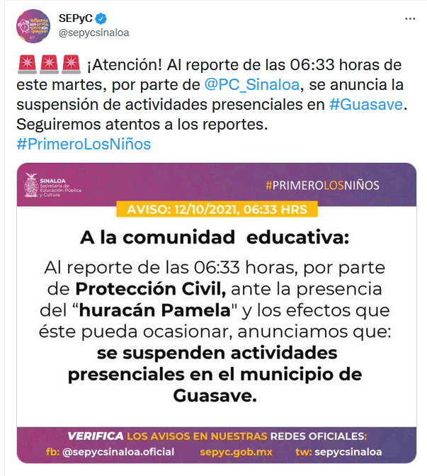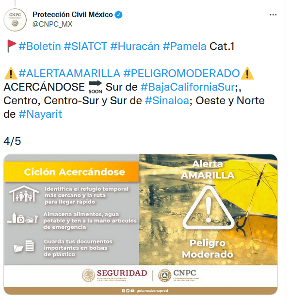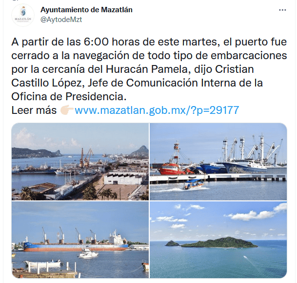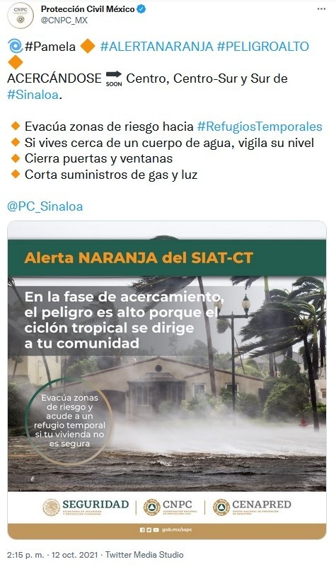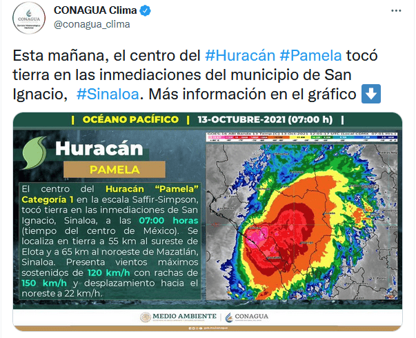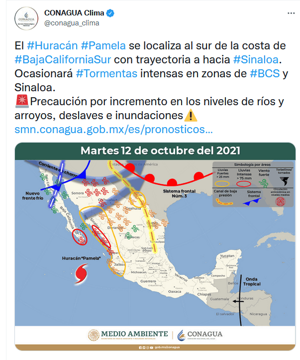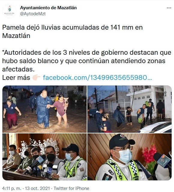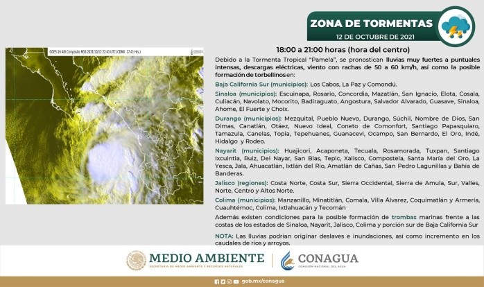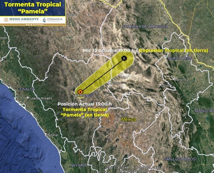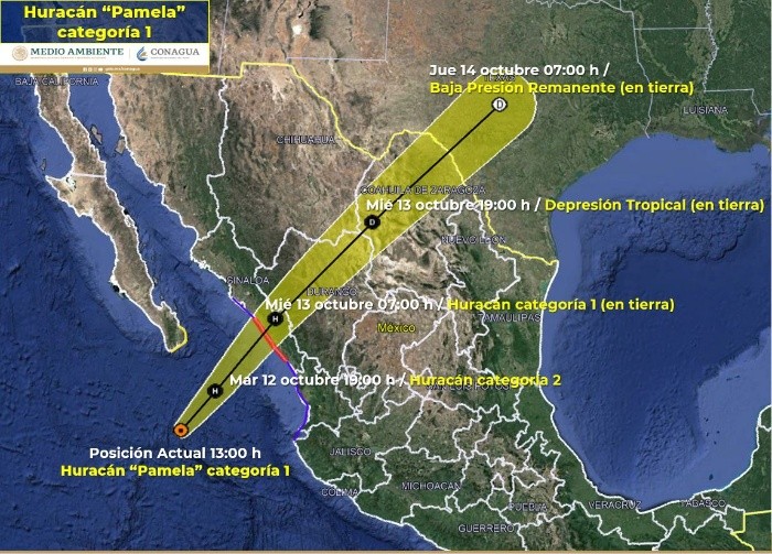 México | Huracán "Pamela" en vivo: Trayectoria y noticias al momento Estas son las actualizaciones, reportes de lluvia, inundaciones y otras afectaciones por ciclón en el Pacífico mexicano Redacción Digital . 13 de octubre de 2021 - 16:20 hs Deslaves en la autopista Durango a Mazatlán 2021-10-13 05:45La autopista Durango a Mazatlán registra deslaves que han provocado el cierre a la circulación, como un punto en el kilómetro 154, que a las 6:00 PM permanecía cerrado en ambos sentidos informó Caminos y Puentes Federales de Ingresos y Servicios Conexos (Capufe). "Le sugerimos que antes de iniciar su viaje consulte la información en nuestra línea 074. Atienda las indicaciones viales y maneje con precaución", publicó Capufe en Twitter. #Pamela ahora como tormenta tropical, golpea a #Durango. La carretera que conecta con #Mazatlán está inundada tras deslaves de un cerro contiguo y también por inundaciones. Vídeo: @mael_toto #FórmulaDurango pic.twitter.com/PthrsghHXx — Juan Pablo Pérez Díaz (@PerezDiazMX) October 13, 2021 18:45 horas Mazatlán reporta saldo blanco 2021-10-13 16:20El Ayuntamiento de Mazatlán informó que hay saldo blanco tras el paso de "Pamela" y reportó daños como inundación de algunas viviendas, caída de árboles, tendido eléctrico y estructuras. “Mazatlán está tranquilo y con saldo blanco. Las actividades económicas se irán restableciendo paulatinamente, igual el servicio de transporte”, dijo el coordinador de Protección Civil Municipal, Eloy Ruiz Gastélum. 17:20 horas "Pamela" ya es depresión tropical 2021-10-13 15:10La tormenta tropical "Pamela" se degradó esta tarde a depresión tropical sobre el norte de México, informó el Centro Nacional de Huracanes estadounidense (NHC). A las 16:00 horas, el meteoro se localizaba a 415 kilómetros al noreste de Mazatlán, con vientos máximos sostenidos de 55 km/h. Detalló que las fuertes lluvias y la amenza de inundaciones repentinas por los efectos de "Pamela" irán disminuyendo hacia esta noche sobre México. Además se espera que sus remantes lleguen e jueves a Texas y Oklahoma, en Estados Unidos. 16:10 horas Evacuan a pobladores en Durango 2021-10-13 14:10Protección Civil de Durango dio a conocer la evacuación de alrededor de 25 personas en El Salto, municipio de Pueblo Nuevo, luego de que un canal llegó a su máxima capacidad. (2) Fueron alrededor de 25 personas evacuadas y concentradas en el refugio temporal de El Salto. Continúa el monitoreo en todo el estado por el paso de la tormenta tropical "Pamela".#PrevenirEsVivir �� pic.twitter.com/uZ8HyMyDfl — PROTECCIÓN CIVIL DURANGO (@CEPCDurango) October 13, 2021 15:10 horas Prevén que se vuelva depresión tropical esta tarde 2021-10-13 13:50El SMN informó que a las 13:00 horas, "Pamela" continúa como tormenta tropical y su centro se ubicaba sobre el estado de Durango. Su localización es a 120 km al norte de la ciudad de Durango y a 270 km al noreste de Mazatlán, Sinaloa. Agregó que se descontinúa zona de prevención por efectos de tormenta tropical desde Bahía Tempehuaya hasta Escuinapa, Sinaloa. Se espera que el ciclón se debilite esta tarde a depresión tropical. 14:50 horas Restringen ingreso al mar en Puerto Vallarta 2021-10-13 12:40Protección Civil de Jalisco informó que se restringió el acceso al mar en las playas de Puerto Vallarta, debido a que el oleaje alcanza 2.5 metros de altura. 13:40 horas "Pamela" deja daños en Mazatlán 2021-10-13 12:20Daños en estructuras de comercios se observan hoy en Mazatlán, Sinaloa, por los efectos del huracán. Así quedó un bar afectado por el huracán. AP/R. Echeagaray En un área de comercios. AP/R. Echeagaray Vidrios rotos en un banco. AP/R. Echeagaray 13:20 horas Captan en videos llegada del huracán a Sinaloa 2021-10-13 11:40Usuarios de redes sociales compartieron videos de la llegada del huracán "Pamela" y los estragos que ha ocasionado en Mazatlán. En vivo SARC desde Mazatlán #HuracánPamela. pic.twitter.com/GB2omH6t4p — SARC Consultoría en Análisis de Riesgo (@sarcmx) October 13, 2021 12:40 horas "Pamela" se debilita a tormenta tropical 2021-10-13 11:00"Pamela" se debilitó a tormenta tropical sobre terriotorio mexicano, luego de tocar tierra esta mañana como huracán categoría 1 en Sinaloa, según informó el Servicio Meteorológico Nacional (SMN). A las 10:00 horas el ciclón se localizaba en tierra sobre Durango, a 140 kilómetros al nor-noreste de Mazatlán, Sinaloa, y 145 kilómetros al oeste-noroeste de la ciudad de Durango, con vientos máximos sostenidos de 100 km/h y rachas de 150 km/h. 12:00 horas Evacuan cuatro municipios de Sinaloa por paso de huracán "Pamela" 2021-10-13 07:36 Vista del municipio de Culiacán, afectado por el huracán "Pamela" y que se mantiene en alerta roja por las lluvias. AFP / R. Frías En los municipios de Elota, Escuinapa, Rosario y Mazatlán, los cuerpos de auxilio evacuaron a familias de sus hogares ante la cercanía del huracán "Pamela". Se mantiene la alerta roja en los municipios de Culiacán, Badiraguato, Cosalá, Concordia Elota, Escuinapa, San Ignacio, Rosario, Mazatlán y Navolato,. Guillermo Benítez Torres, presidente municipal de Mazatlán, dio a conocer que en la sindicatura de Villa Unión se envió albergues provisionales a cerca de 100 familias y que el arroyo de Jabalíes se desbordó por el alto volumen de agua que arrastra por lo que pidió a la ciudadanía mantenerse en sus hogares, ante la inminente entrada a tierra. La noche del martes, las autoridades del municipio de Elota dispusieron evacuar a 300 familias de ocho pequeñas comunidades susceptibles a inundaciones, las cuales fueron colocadas en los albergues provisionales donde los dotaron de comida, cobijas y colchonetas. "Pamela" toca tierra en Sinaloa como huracán categoría 1 2021-10-13 07:00 TWITTER EFE El huracán "Pamela", de categoría 1 en la escala Saffir-Simpson, tocó tierra este miércoles en el estado de Sinaloa ocasionando fu