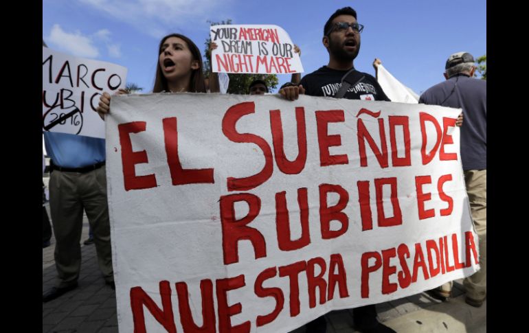 Internacional | Se manifestaron frente a un edificio en Miami, donde el candidato realizaba un mitin Activistas protestan contra 'posturas antimigrantes' de Marco Rubio Varios jóvenes se manifestaron frente a un edificio en Miami, donde el candidato realizaba un mitin político Por: NTX 13 de abril de 2015 - 17:36 hs Los manifestantes aseguran que Rubio no está a favor de la comunidad de inmigrantes. AP / L. Sladky MIAMI, ESTADOS UNIDOS (13/ABR/2015).- Un grupo de activistas proinmigrantes protestó hoy contra las "recientes posturas antimigrantes" del senador republicano Marco Rubio, mientras éste anunciaba su candidatura a la presidencia de Estados Unidos. Con pancartas que mostraban las leyendas "Ningún ser humano es ilegal" y "Tu sueño americano es nuestra pesadilla", unos 30 jóvenes se apostaron frente al edificio de la Torre de la Libertad, donde Rubio, hijo de inmigrantes cubanos, realizaba un mitin político. Natalia Jaramillo, de la Coalición de Inmigrantes de Florida, dijo que Rubio "apoyó un proyecto de reforma en el 2013 de camino a la ciudadanía y luego se arrepintió de haberlo hecho". "Queremos saber cuál es su posición ahora que va a ser candidato a presidente, y cómo va a apoyar a la comunidad de inmigrantes indocumentada", señaló la activista. En un comunicado añadieron que el senador "un día lidera un proyecto de ley para la Reforma Migratoria, y luego vota a favor de cortar los fondos para la implementación de la Acción Diferida, y se opone a los programas de alivio para las familias inmigrantes". "Hoy estamos aquí para hacerles saber a todos los votantes y a toda la comunidad quién es el verdadero Marco Rubio, alguien que no está a favor de nuestra comunidad y que el sueño que tiene para este país es nuestra pesadilla", dijo el activista Oliver Medina. Rubio, quien llegó al Senado impulsado por el movimiento ultraconservador Tea Party en 2010, fue uno de los patrocinadores de un proyecto bipartidista de reforma migratoria que buscaba dar solución a más de 11 millones de indocumentados existentes en el país, pero retiró su apoyo al quedar bloqueado en la cámara baja. Rubio se unió a sus colegas republicanos para denunciar ante la justicia la acción ejecutiva del presidente Barack Obama, que permitirá a millones de inmigrantes indocumentados permanecer en Estados Unidos sin temor a ser deportados. La protesta de este lunes fue convocada por las organizaciones United Families, United We Dream, Homestead ERA, la central sindical AFL-CIO en el sur de la Florida, Dreamer's Moms y otros miembros de la Coalición de Inmigrantes de la Florida. Temas Norte América Estados Unidos Republicanos Inmigrantes Elecciones en Estados Unidos Lee También Asesinan a maestra en Oaxaca presuntamente por una calificación Llega "Melissa" al Atlántico; esta es la trayectoria de la tormenta A punto de aparecer el ciclón "Melissa"; a esta distancia está de México Tormenta tropical podría formarse en este punto del Pacífico mexicano Recibe las últimas noticias en tu e-mail Todo lo que necesitas saber para comenzar tu día Registrarse implica aceptar los Términos y Condiciones