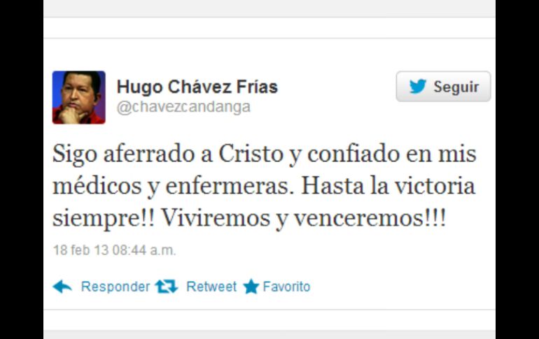 Internacional | El mandatario venezolano publica su último tuit el 18 de febrero Aferrado a Cristo: último tuit de Chávez El mandatario venezolano publica su último tuit el 18 de febrero a su llegada a Venezuela Por: EL INFORMADOR 5 de marzo de 2013 - 16:17 hs GUADALAJARA, JALISCO (05/MAR/2013).- El pasado 18 de febrero, el recién fallecido Hugo Chávez haría pública su continua lucha contra el cancer que padecía en un tuit que fue el último del mandatario, en donde se decía "aferrado a Cristo". "Sigo aferrado a Cristo y confiado en mis médicos y enfermeras. Hasta la victoria siempre! Viviremos y venceremos!" fueron las palabras del mandatario desde su cuenta en Twitter @chavezcandanga. Ese mismo día luego de anunciar su llegada a Venezuela, también por Twitter, agradeció a Fidel y Raúl Castro y a Cuba, lugar donde fue operado y atendido durante el tratamiento de cáncer que continuaría en casa. La cuenta de Hugo Chávez Frías se mantenía en constante actualización enviando mensajes a sus más de cuatro millones de seguidores. Temas América Latina Venezuela Hugo Chávez Twitter Decesos de personalidades Recibe las últimas noticias en tu e-mail Todo lo que necesitas saber para comenzar tu día Registrarse implica aceptar los Términos y Condiciones