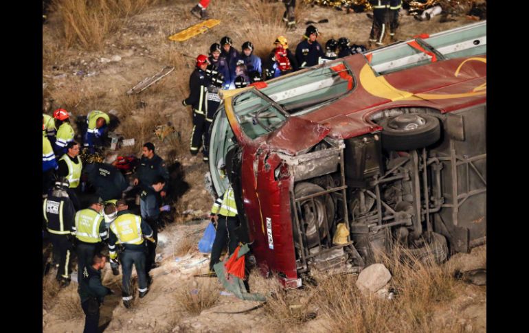 Internacional | Las víctimas regresaban de una excursión religiosa por la capital española Al menos 11 muertos en accidente de autobús en España Las víctimas regresaban de una excursión religiosa por la capital española Por: EFE 8 de noviembre de 2014 - 19:39 hs El autobús accidentado, de unos diez años de antigüedad, había pasado la Inspección Técnica de Vehículos el jueves. EFE / M. Guillén MURCIA, ESPAÑA (08/NOV/2014).- Al menos once personas murieron y otras 39 resultaron heridas al caer un autobús por un terraplén en la ciudad española de Venta del Olivo, en el sureste del país, por causas que aún se desconocen, informaron hoy fuentes oficiales. Este accidente es el tercero más grave de los ocurridos en España desde el año 2000. El autobús se precipitó hacia las 23:20 horas (hora local) de este sábado (16:20 hora de México) por una pendiente de unos 15 metros en la carretera que une la Venta del Olivo con Calasparra, en la provincia de Murcia, y volcó sobre un lateral en un desnivel. El director general de Emergencias del Gobierno regional de Murcia, Luis Gestoso, informó que diez personas murieron en el accidente, y otra a su llegada a un hospital al que había sido trasladado. Los heridos, algunos de ellos de gravedad, sufren fracturas y lesiones de diversa índole, según Gestoso. Todos los heridos han sido evacuados y se espera el levantamiento de los cadáveres para practicar las autopsias. El accidente ocurrió cuando el autobús regresaba desde Madrid al municipio de Bullas, de donde son originarias las víctimas, tras viajar a la capital española en un viaje organizado por una parroquia para una excursión religiosa. El obispo de la diócesis de Cartagena, José Manuel Lorca Planes, expresó la consternación de la Iglesia católica por lo ocurrido, dijo que entre los heridos se encuentra el párroco de Bullas, y que en este viaje religioso había "mucha gente joven". El autobús accidentado, de unos diez años de antigüedad, había pasado la Inspección Técnica de Vehículos el jueves, según informó el propietario de la empresa de autobuses, José Ruíz. Temas Europa Accidentes en el mundo España Lee También Jugadores de LaLiga se manifiestan contra el partido en Miami Protestan contra Trump en Estados Unidos Accidente de autobús en Brasil deja 15 muertos Hombre murió solo en su casa y su cuerpo fue hallado 15 años después, esto pasó Recibe las últimas noticias en tu e-mail Todo lo que necesitas saber para comenzar tu día Registrarse implica aceptar los Términos y Condiciones