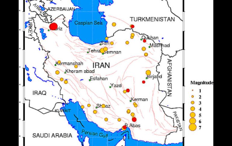 Internacional | El sismo de 6.4 grados en la escala de Richter causa numerosas muertes en Irán Al menos 30 muertos por sismos en Irán Los principales daños se registraron en cuatro distritos, los heridos, cerca de 400, recibieron atención médica, el sismo tuvo varias réplicas Por: NTX 11 de agosto de 2012 - 11:31 hs Mapa que muestra los principales puntos en que se dio el terremoto. ESPECIAL / MOSCÚ, RUSIA (11/AGO/2012).- Al menos 30 personas murieron hoy y otras 400 resultaron heridas en el noroeste de Irán, debido a derrumbes provocados por un sismo de 6.4 grados en la escala de Richter, informó el Centro para Atención de Emergencias. Según reportó la televisora iraní Press Tv, el Centro para Atención de Emergencias precisó que el sismo afectó la ciudad de Ahar, cerca de Tabriz, capital de la provincia de Azerbaiyán oriental, a las 15:53 hora local (12:23 GMT). Los principales daños se registraron en los distritos de Ahar, Varzaqan, Mehraban y Haris, de acuerdo con los informes. El director del Centro, Gholamreza Masoumi, dijo que se ha confirmado la muerte de entre 30 y 40 personas, y que los reportes mencionan unos 400 heridos que fueron trasladados a hospitales de Tabriz y la cercana ciudad de Ardebil. El encargado de rescates de la Organización Iraní de la Luna Media Roja, Mahmud Mozaffar, precisó que 66 rescatistas fueron enviados al área afectada por el sismo. Por su parte, el vocero de la Organización Nacional de Manejo de Desastres en Irán, Morteza Akbarpur, indicó que hasta el momento se han registrado 11 réplicas del sismo, en la región noroccidental del país. Un sismo de 6.4 grados Richter se registró a las 15:53 horas locales (12:23 GMT) de este sábado en Irán, con epicentro a unos 60 kilómetros al este-noreste de la ciudad de Tabriz, y a una profundidad de 9.8 kilómetros. Este primer sismo fue seguido por otro de 6.3 grados a las 16:04 hora local (12:34 GMT), y más tarde, se registraron otras réplicas, varias de ellas de magnitud superior a los cuatro grados, de acuerdo con informes del Servicio Geológico de Estados Unidos. Temas Medio Oriente Irán Sismos Lee También Terremoto de magnitud 7.6 sacude el sur de Filipinas Llega "La Niña" y este será su impacto según las predicciones Sismos afectan nuevamente el sur del país esta madrugada Varios sismos de magnitud moderada se registraron en el sur del país Recibe las últimas noticias en tu e-mail Todo lo que necesitas saber para comenzar tu día Registrarse implica aceptar los Términos y Condiciones