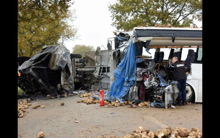 PARÍS, FRANCIA (14/NOV/2016).- Una persona ha muerto y al menos otras tres han resultado heridas graves, de las que dos están entre la vida y la muerte, en un accidente entre un autobús escolar y un camión ocurrido hoy cerca de la ciudad francesa de Arras (norte).La fallecida es la conductora del autocar, de 47 años, y los dos heridos de extrema gravedad son el chófer del camión y uno de los escolares, indicó la Prefectura (delegación del Gobierno).El subprefecto de Arras, Marc del Grande, señaló en unas declaraciones al canal "BFM TV" que el siniestro se produjo hacia las 07:45 hora local (06:45 GMT) en la carretera nacional 25, en las proximidades de Bavincourt l'Arbret.Según la página web del diario "La Voix du Nord", uno de los estudiantes que viajaba en el autobús salió despedido del vehículo y otros dos tuvieron que ser extraídos por los bomberos.En el autobús viajaban una docena de alumnos del colegio de Val du Gy, de la localidad de Avesnes-le-Comte.Las primeras imágenes de televisión mostraron que la cabina del camión (que transportaba remolacha) había quedado totalmente calcinada y la parte delantera del autocar aplastada.