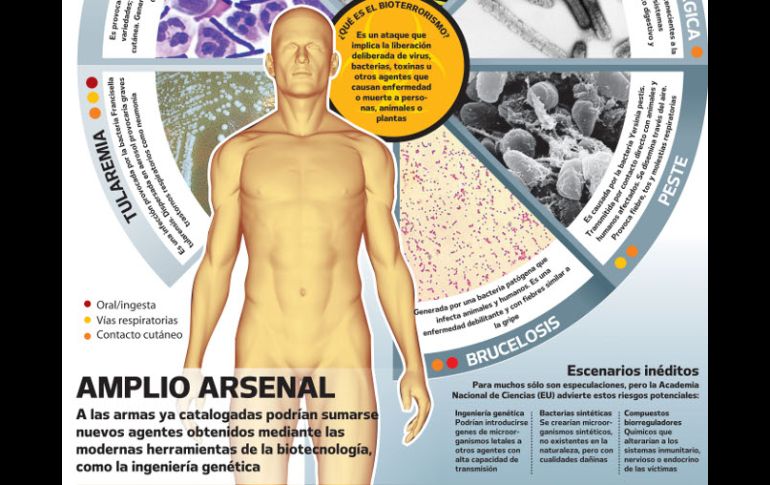 CIUDAD DE MÉXICO (06/SEP/2011).- El uso de armas biológicas contra la población civil es una práctica añeja, que reavivó el temor mundial tras los atentados del 11-S y la cruzada de EU contra grupos extremistas. Pero ahora el fantasma del bioterrorismo podría adquirir un perfil inédito aún más amenazante montado en los más recientes avances de la ciencia.Al arsenal de microbios y toxinas convencionales, clasificados, experimentados y en algunos casos usados desde hace décadas, como viruela, ébola, tularemia o ánthrax, podría sumarse un nuevo tipo de armas obtenidas mediante ingeniería genética, transferencia de ARN o biología sintética.Esto no es descartable aunque parezca un relato de ciencia-ficción, señalan especialistas consultados, pues en todas las épocas se han aprovechado los nuevos conocimientos científicos para el diseño de armas biológicas que luego son llevadas del laboratorio a los escenarios bélicos o terroristas.“Todo lo que se ha desarrollado desde el punto de vista biotecnológico, como virus, bacterias, enzimas u organismos modificados puede ser utilizado de esa manera”, advierte Benjamín Ruiz Loyola, de la Facultad de Química de la Universidad Nacional Autónoma de México (UNAM), quien recuerda que cualquier conocimiento es susceptible de aplicarse al bien o al mal. Virus y agroterrorismoRuiz Loyola descarta que el VIH pudiera usarse eficazmente con fines terroristas, pues su mecanismo de infección es por contacto directo (sexual, perinatal o sangre) entre personas. En cambio, dice, un virus transmisible por el aire —como el gripal H1N1— podría diseminarse con facilidad por el planeta.El gran obstáculo, explica el profesor, es que quienes manejen tales armas tendrían que contar necesariamente con vacunas o antídotos para evitar contagiarse a sí mismos. Por ello, cree más factible —y potencialmente más peligroso— el ataque ya no contra seres humanos, sino dirigido a los insumos de los que dependemos.“Existe una rama del terrorismo que se conoce como agroterrorismo. Consiste en atacar no directamente a los seres humanos, sino a aquello que nos provee de alimento, con microorganismos o sustancias que dañen cultivos específicos o animales”, añade el académico, ex inspector de armas químicas de la ONU en Irak.Un ejemplo: en 2008 el Departamento de Agricultura en EU añadió a su lista de potenciales armas bioterroristas una bacteria llamada Xanthomonas oryzae, que afecta al arroz, según la agencia Nature news. No es difícil imaginar el impacto de un ataque a este cultivo, del que se produjeron 464 millones de toneladas en el globo en 2010. Peligros emergentesUn informe de la Academia de Ciencias en EU consigna que más allá de elaborar listas de microbios y toxinas, es preciso anticipar los peligros emergentes de un bioterrorismo de “nueva generación”. Focalizar la atención en la viruela o la toxina botulínica, advierte, puede desviar recursos para afrontar amenazas de nuevo cuño como las derivadas de la biología sintética o la manipulación del código genético.El reporte elaborado en 2005 sugiere que pronto será posible diseñar virus patógenos con un Ácido Desoxirribonucleico (ADN) sintético, es decir, no existente en la naturaleza (ya se logró transferir material genético a una bacteria artificial, ver Conciencia, 14 de junio de 2010). También prevé la producción de sustancias inhalables que diseminarían genes dañinos específicos.Por su parte, un ensayo publicado en la revista Nature sobre las implicaciones de la bacteria artificial generada por Craig Venter el año pasado (Life after the synthetic cell) expone la opinión de 8 especialistas en el área.George Church, uno de los colaboradores y genetista de la Universidad de Harvard, pide una regulación estricta para este tipo de investigaciones de modo que se eviten escenarios de “bioterror o bioerror”, es decir, la liberación deliberada o accidental de agentes nocivos y desconocidos al ambiente.Pero para el biólogo Antonio Lazcano, de la Facultad de Ciencias de la UNAM, esos temores están exacerbados y no son realistas, pues, señala, aún falta un largo camino por recorrer.En la literatura y el cineLos escenarios de ataques bacteriológicos no son exclusivos de las mentes terroristas: también han nutrido la imaginación literaria y cinematográfica.Soy leyenda. Novela de ciencia-ficción-terror de Richard Matheson. Narra las consecuencias de una pandemia provocada por agentes microbianos que transforman a los infectados en vampiros.Epidemia. Cinta de 1995 dirigida por Wolfgang Petersen. Un peligroso virus surgido en Zaire y contenido tras la intervención del Ejército de EU se sale de control debido a un mono portador que llega a este país en un barco.Exterminio. Película británica dirigida por Danny Boyle. Narra la forma en que los ingleses se transforman en seres violentos y primitivos tras exponerse a un virus transmitido por monos liberados por defensores animales.Cazadores de microbios. Un libro clásico de Paul de Kruif. Se trata de una obra que describe la historia de los hallazgos más importantes en el mundo de la microbiología, impulsados gracias a la invención de la lente.Pox. Novela del médico Richard Reinkin. Cuenta los planes de 4 terroristas del Medio Oriente que tras infectarse a sí mismos con viruela en Somalia se dirigen a 4 ciudades en EU para contagiar el virus a una multitud que realiza compras en Navidad.The Jihad Germ. Novela de “bioterrorismo y seguridad pública” de T. N. Rivers, también escenificada en EU. Una nueva arma infecciosa desata una crisis sanitaria que los políticos se esfuerzan afanosamente por contener.El origen del planeta de los simios. Filme de Rupper Wyatt. El protagonista se lleva a casa a un mono utilizado por científicos para probar tratamientos contra el Alzheimer y cuya inteligencia ha mejorado, pero esto se convierte en una amenaza.