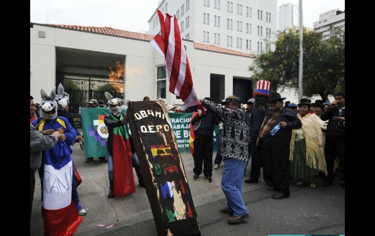 Internacional | Exigen el cierre de la embajada estadounidense en su país Bolivianos queman banderas de EU y países europeos Manifestantes exigen el cierre de la embajada estadounidense en su país Por: AP 8 de julio de 2013 - 16:09 hs Simpatizantes del presidente realizan esta manifestación para mostrar su inconformidad con el trato de estos países hacia Evo Morales. AFP / LA PAZ, BOLIVIA (08/JUL/2013).- Vendedores callejeros y simpatizantes del presidente Evo Morales quemaron banderas estadounidenses y de países europeos frente a la embajada de Estados Unidos el lunes en una multitudinaria manifestación de apoyo al mandatario cuyo avión fue impedido de sobrevolar por cuatro países de Europa la semana pasada, por sospechas de que ocultaba en la aeronave al ex analista de seguridad Edward Snowden. Además de la bandera estadounidense, fueron quemadas las de Francia, España, Italia y Portugal en las puertas de la embajada de Estados Unidos y lanzaron petardos que estallaron en el frente del edificio que había cerrado sus puertas. No hubo policías para resguardar el edificio y los manifestantes se retiraron en lenta marcha sin provocar mayores incidentes tras lanzar consignas en contra del gobierno de Washington. Poco más de dos horas duró el paso de la manifestación por la sede diplomática ubicada cerca del centro de La Paz y a tres cuadras de la residencia presidencial. La protesta paralizó el tráfico en el centro de la urbe. "Los gremialistas estamos indignados por el sabotaje de cuatro países europeos lacayos del imperialismo que han mellado la dignidad de nuestro presidente y exigimos al gobierno el cierre de la embajada de Estados Unidos", dijo en un discurso Rodolfo Mansilla, líder de la organización que agrupa a vendedores informales de La Paz y de la vecina El Alto. Mansilla dijo a sus bases que exigirán a la Asamblea Legislativa la expulsión de los representantes diplomáticos de Francia, España, Italia y Portugal en caso de que no se disculpen ante el gobierno boliviano. Morales acusó a Washington de haber tramado el complot en su contra en complicidad con los cuatro países que el martes de la semana pasada le negaran el paso por su espacio aéreo obligando a desviar su aeronave a Viena, Austria, donde el mandatario estuvo varado poco más de trece horas. El jueves, ante una asamblea popular de sus seguidores, Morales dijo que no temblará la mano si decide cerrar la embajada estadounidense. Mientras los manifestantes desfilaba lanzando consignas, la ministra de Comunicación, Amanda Dávila, declaró en el palacio presidencial que la cancillería de su país convocó a los embajadores de España, Francia e Italia y al cónsul de Portugal para "expresar una protesta" y reclamar "una explicación sobre lo sucedido con el avión presidencial". Los presidentes de Argentina, Ecuador, Venezuela y Surinam, junto a Morales se reunieron en Cochabamba, Bolivia, el jueves para manifestar su solidaridad al gobernante boliviano y firmaron una resolución para exigir a esos países a que se disculpen con el gobierno boliviano. Tras el incidente con su aeronave, Morales anunció el sábado que si Snowden se lo pide, le otorgará asilo en Bolivia en protesta por el bloqueo aéreo y por razones humanitarias. Sin embargo, su canciller David Choquehuanca aclaró el domingo que no llegó un pedido oficial del ex analista requerido por el gobierno de su país por revelar secretos de estado. La Organización de los Estados Americanos convocó el martes a un consejo extraordinario en Washington para analizar lo sucedido con Morales y escuchar un informe del gobierno boliviano sobre el incidente, dijo Dávila. Las relaciones entre Bolivia y Estados Unidos están en su peor momento desde la expulsión del embajador estadounidense en La Paz en 2008 por supuesta confabulación con los opositores, a lo que siguió la salida forzada de otras agencias de cooperación de ese país, entre ellas la DEA. El senador opositor Herman Antelo comentó el lunes que el gobierno busca capitalizar políticamente el incidente para levantar la imagen de Morales cuya popularidad ha mermado en el último tiempo. Temas América Latina Estados Unidos Bolivia Evo Morales Lee También "Raymond" baja su potencia, pero tocará tierra en horas En Hidalgo, caminos destrozados complican rescates y ayuda Así se celebrará en Guanajuato el Día de Muertos Lluvias dejan 37 muertos en cuatro estados de México Recibe las últimas noticias en tu e-mail Todo lo que necesitas saber para comenzar tu día Registrarse implica aceptar los Términos y Condiciones