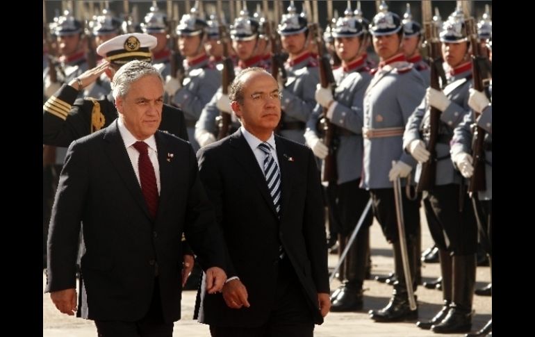 Internacional | El presidente de Chile da la bienvenida a su homólogo mexicano Calderón es recibido por Piñera en La Moneda En el segundo día de su gira, acude a la ceremonia de recepción oficial en el palacio de gobierno Por: NTX 7 de junio de 2012 - 13:01 hs SANTIAGO, CHILE (07/JUN/2012).- El presidente de Chile, Sebastián Piñera, recibió a su colega de México, Felipe Calderón, en el Palacio de La Moneda, en el marco de la visita de Estado que el Mandatario mexicano realiza este jueves. El gobernante mexicano arribó al palacio de gobierno a las 13:50 horas locales (17:50 GMT) escoltado por un cuerpo de caballería del Ejército, y tras bajarse del vehículo, cruzó la céntrica Plaza de la Constitución a través de una larga alfombra roja. Un destacamento del Ejército rindió honores a ambos jefes de Estado frente al Palacio de La Moneda, construido por el arquitecto italiano Joaquín Toesca de 1786 a 1805, tras lo cual una banda castrense interpretó los himnos de Chile y México. A su ingreso al Palacio, la Guardia Presidencial de La Moneda, un cuerpo de élite de la militarizada policía de Carabineros, saludó a ambos mandatarios, quienes luego procedieron a ingresar al palacio para sostener una reunión privada. Calderón arribó a Chile en la madrugada del miércoles para participar en la IV Cumbre de la Alianza del Pacífico, realizada en Cerro Paranal, en el norte del país, junto con Piñera y los presidentes de Colombia, Juan Manuel Santos, y de Perú, Ollanta Humala. Tras la recepción oficial en el palacio de gobierno, el Presidente Calderón viajará a la ciudad de Valparaíso, ubicada a 120 kilómetros al noroeste de Santiago, donde participará en una audiencia solemne en el Congreso de la República. Temas América Latina Felipe Calderón Chile Sebastián Piñera Recibe las últimas noticias en tu e-mail Todo lo que necesitas saber para comenzar tu día Registrarse implica aceptar los Términos y Condiciones