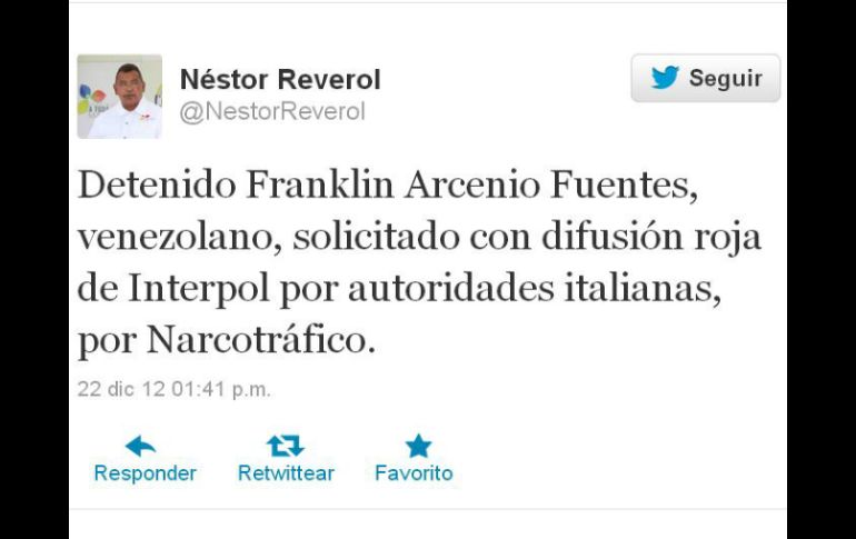 Internacional | La Interpol se encargó del arresto de Franklin Arcenio Fuentes Capturan a narcotraficante venezolano requerido por Italia En los últimos dos años, las autoridades venezolanas han detenido a importantes líderes de tráfico de drogas Por: AFP 22 de diciembre de 2012 - 19:00 hs Néstor Reverol dio a conocer la noticia a través de su cuenta en Twitter. ESPECIAL / CARACAS, VENEZUELA (22/DIC/2012).- Las autoridades venezolanas detuvieron a un presunto narcotraficante requerido por Italia a través de Interpol, informó este sábado el ministro de Interior y Justicia, Néstor Reverol. "Detenido Franklin Arcenio Fuentes, venezolano, solicitado con difusión roja de Interpol por autoridades italianas por narcotráfico", escribió el responsable en su cuenta en la red social Twitter, añadiendo en otro mensaje que indica que la captura se realizó en Caracas. En los últimos dos años, las autoridades venezolanas han detenido a importantes líderes de tráfico de drogas, especialmente colombianos. El capo colombiano del narcotráfico alias el "Loco Barrera" fue detenido el 18 de septiembre en el estado venezolano de Táchira (oeste) y deportado a su país en noviembre. Se calcula que su organización envió en los últimos años a Estados Unidos y Europa más de 900 toneladas de cocaína. Venezuela es señalada por Naciones Unidas como un país libre de cultivos ilícitos, pero considerada un importante punto de tránsito de drogas hacia los grandes mercados consumidores. Temas América Latina Narcotráfico Venezuela Lee También ¿Qué representa el amparo de Bermúdez Requena para la FGR? Cae un integrante de célula delictiva de “Los Chapitos” Kevin Álvarez busca aprovechar su oportunidad con la Selección Urge un “hasta aquí” Recibe las últimas noticias en tu e-mail Todo lo que necesitas saber para comenzar tu día Registrarse implica aceptar los Términos y Condiciones
