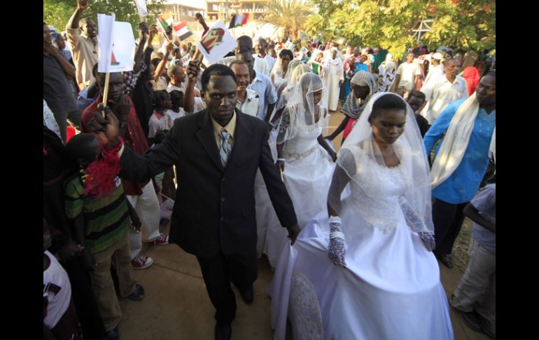 Internacional | La ceremonia constituye un acto de unidad Celebran boda masiva más de 500 parejas La ceremonia constituye un acto de unidad Por: REUTERS 14 de noviembre de 2010 - 04:16 hs En la imagen algunas de las parejas bailan en su entrada al lugar de la ceremonia, acompañados de familiares y amigos. REUTERS / SUDÁN (14/NOV/2010).- Más de 500 parejas del Sur y Norte de Sudán se casan en una boda masiva. La ceremonia fue organizada como un acto de unidad en Jartum. Quedan dos meses para que en el Sur de Sudán voten por un referendo que se espera resulte en la independencia entre estas naciones. Temas África Sudán Recibe las últimas noticias en tu e-mail Todo lo que necesitas saber para comenzar tu día Registrarse implica aceptar los Términos y Condiciones